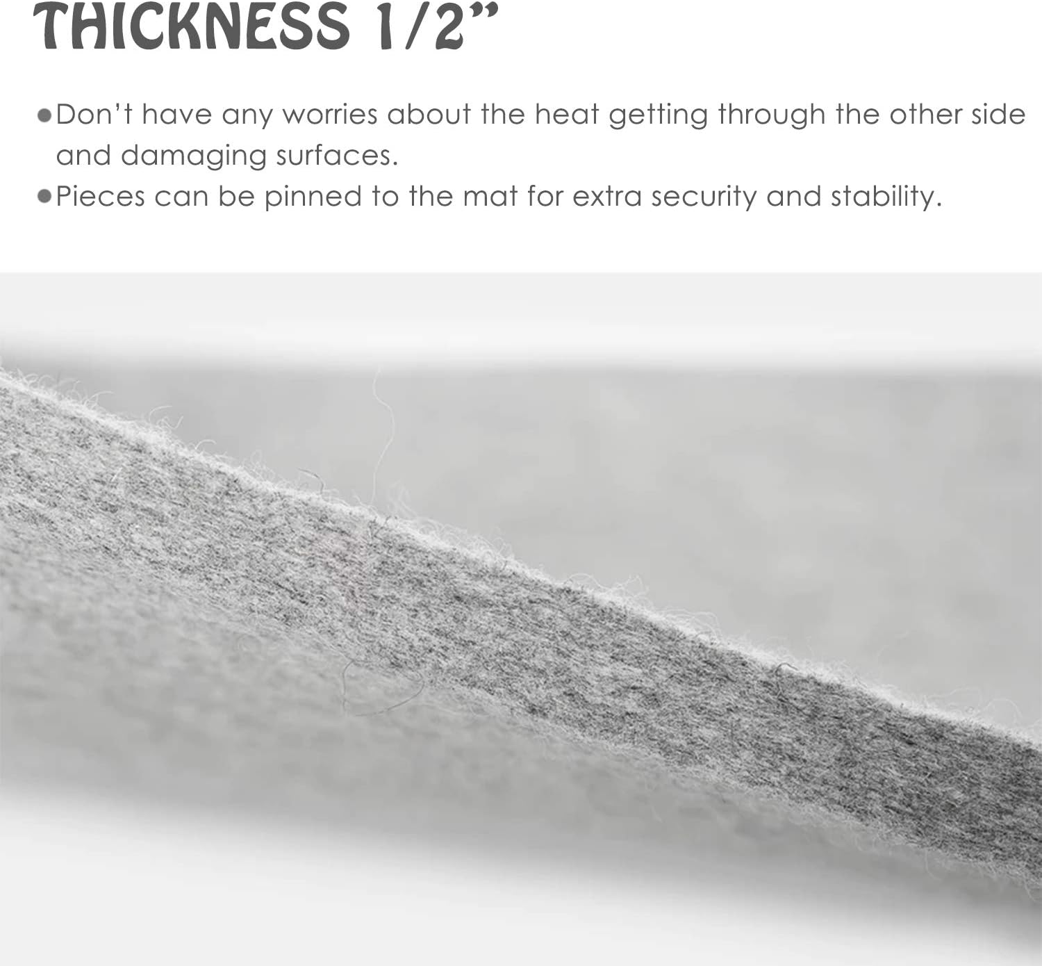 • PROTECTIVE 1/2″ THICK - this magic pressing mat is 1/2 inch thick so you don’t have any worries about the heat getting through the other side and damaging surfaces. Pieces can be pinned to the mat for extra security and stability.
