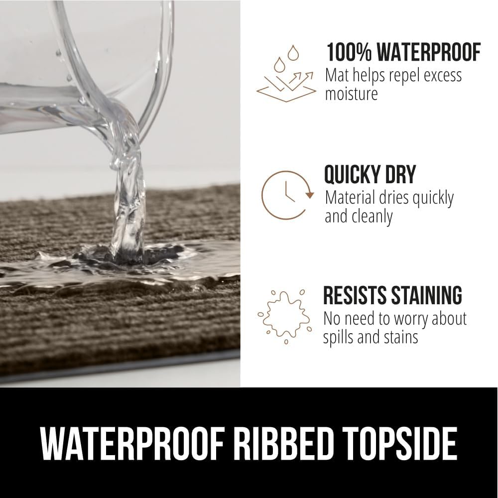 • WATERPROOF RIBBED TOPSIDE: ultra absorbent and 100% waterproof, the mat's surface helps to capture excess water and moisture; plus, premium fabric dries quickly and resists staining and fading for long lasting use