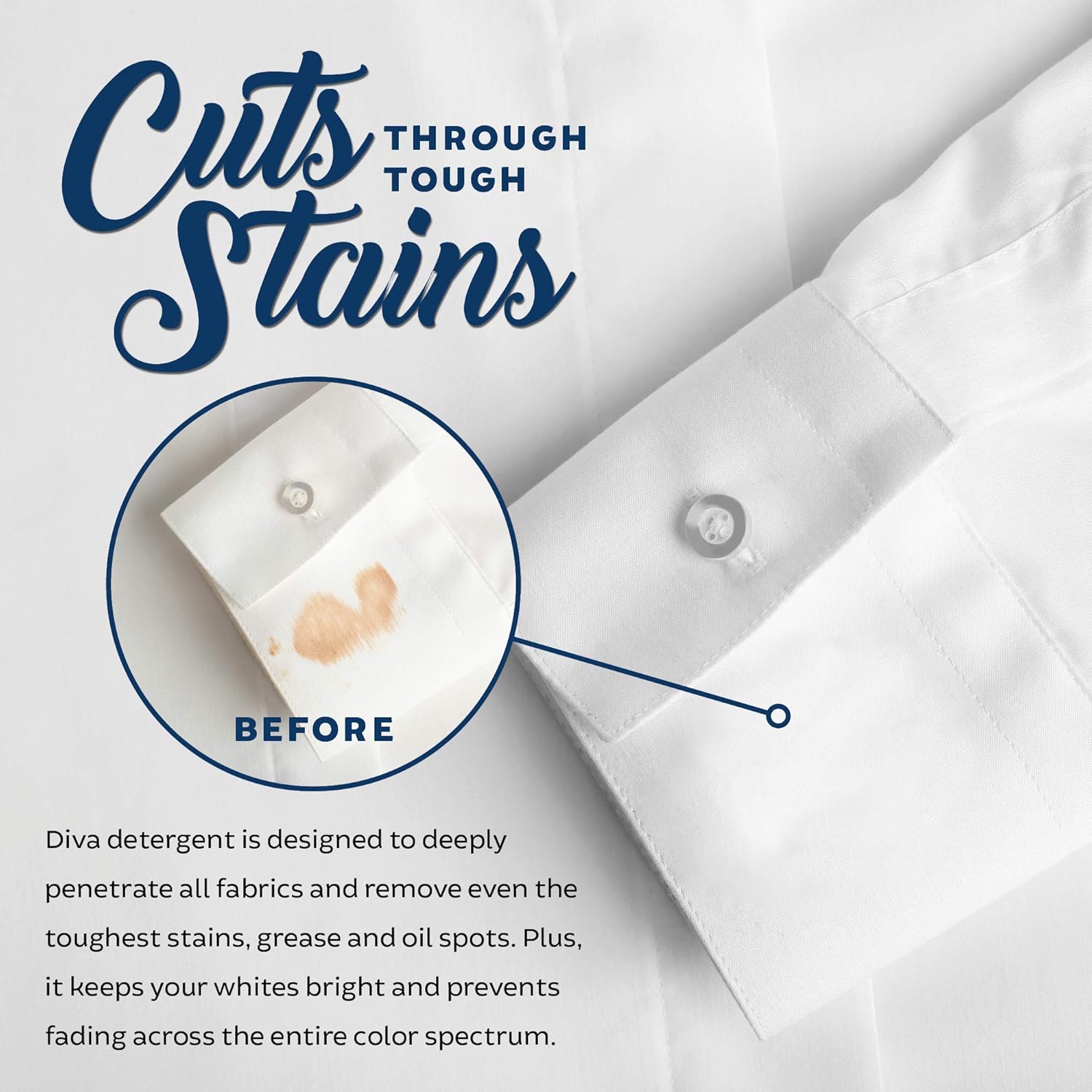 • ELIMINATES TOUGH STAINS - DIVA laundry detergent liquid is designed to clean all fabrics and remove even the toughest stains. For maximum effectiveness, pre-treat stains directly with detergent, then wash on Warm.