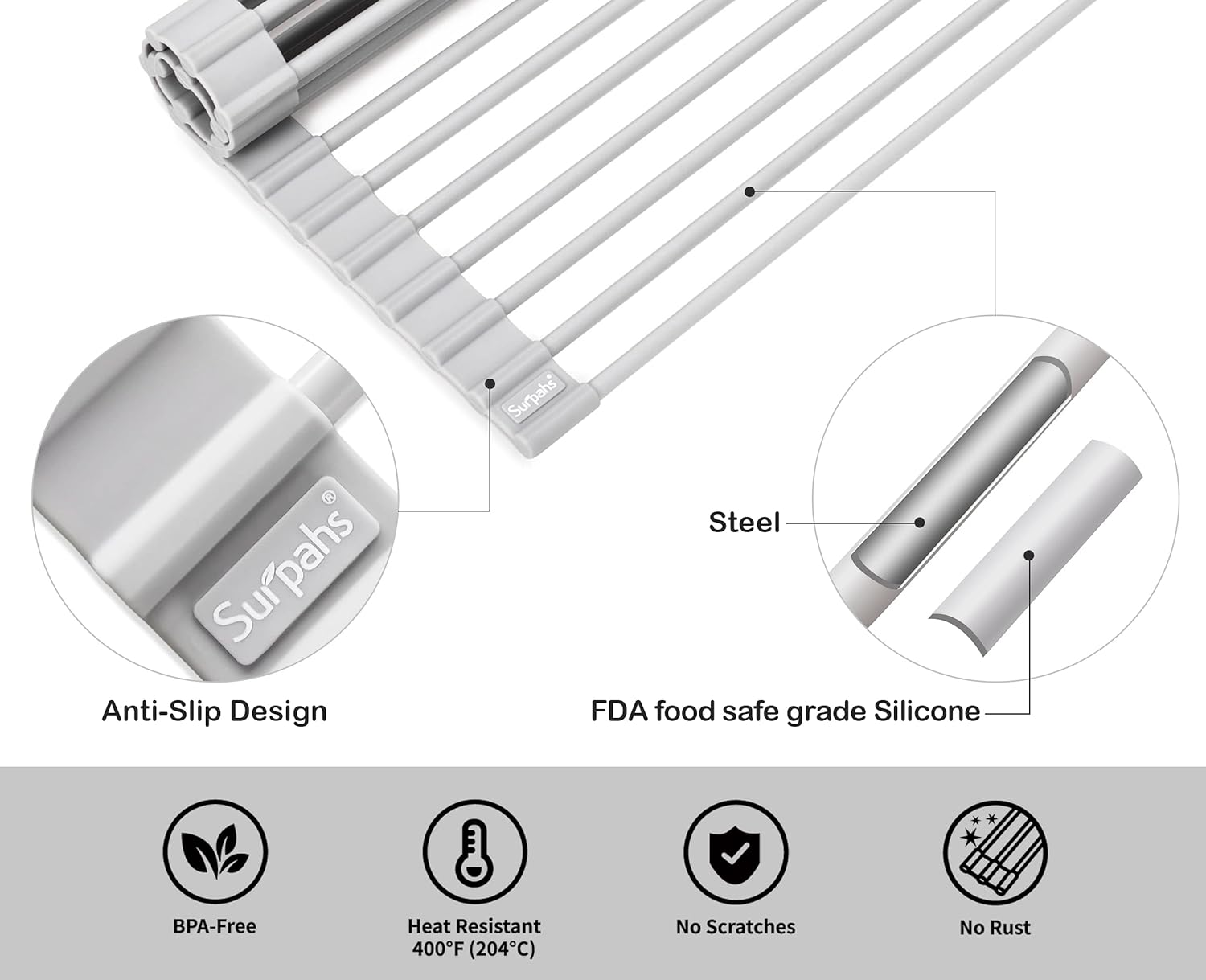 Surpahs Over Sink Foldable Multipurpose Roll-Up Dish Drying Rack, Silicone Wrapped Stainless Steel, Warm Gray, 17.5" x 13.1"