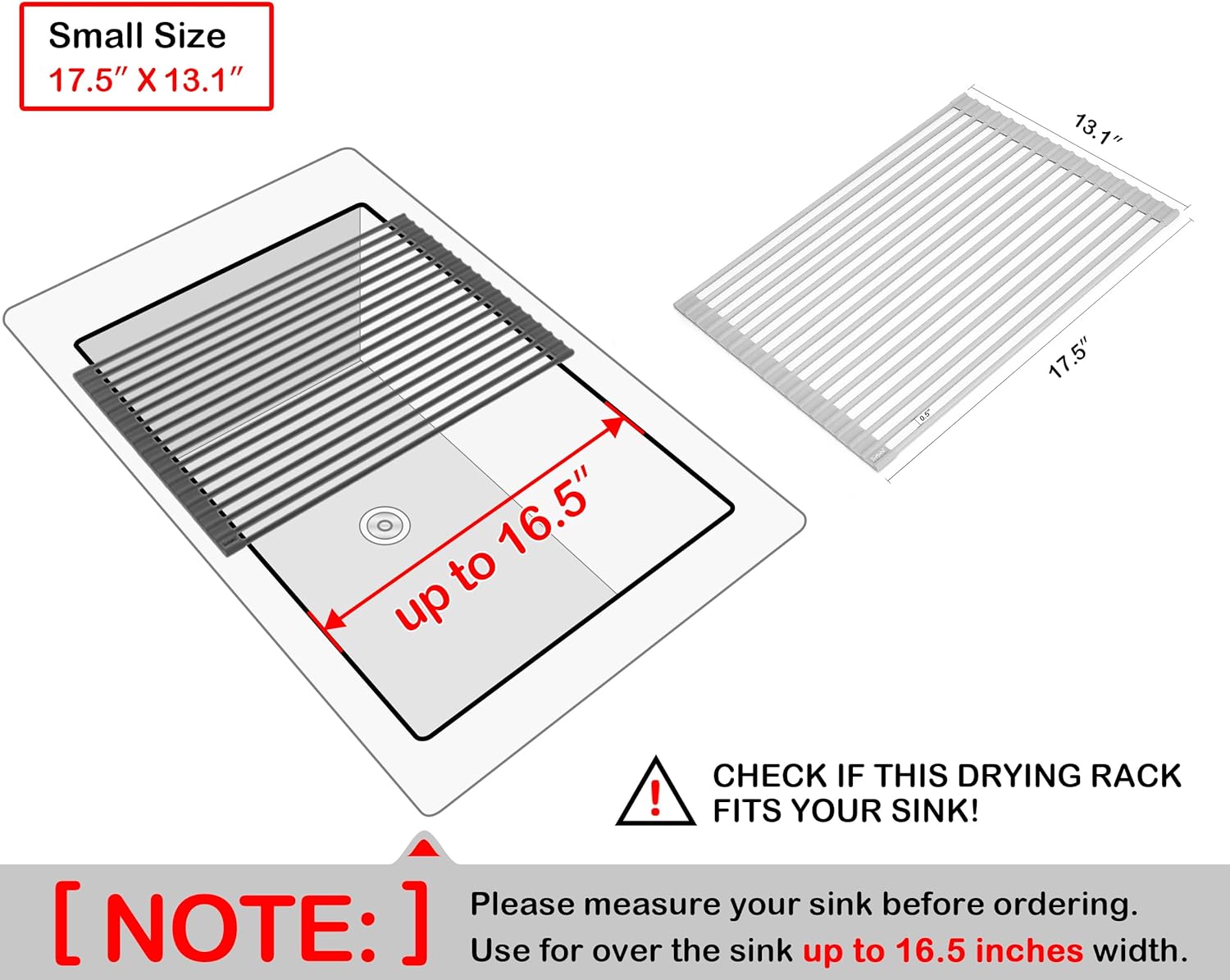 • Small Size, 17.5 x13.1 inches. Use for over the sink up to 16.5 inches width. [*** NOTE * - Please measure your sink before ordering. If your sink is wider than 16 inches please order a larger model *** ]. High-end quality, made of FDA food safe grade silicone wrapped stiff metal steel rods.