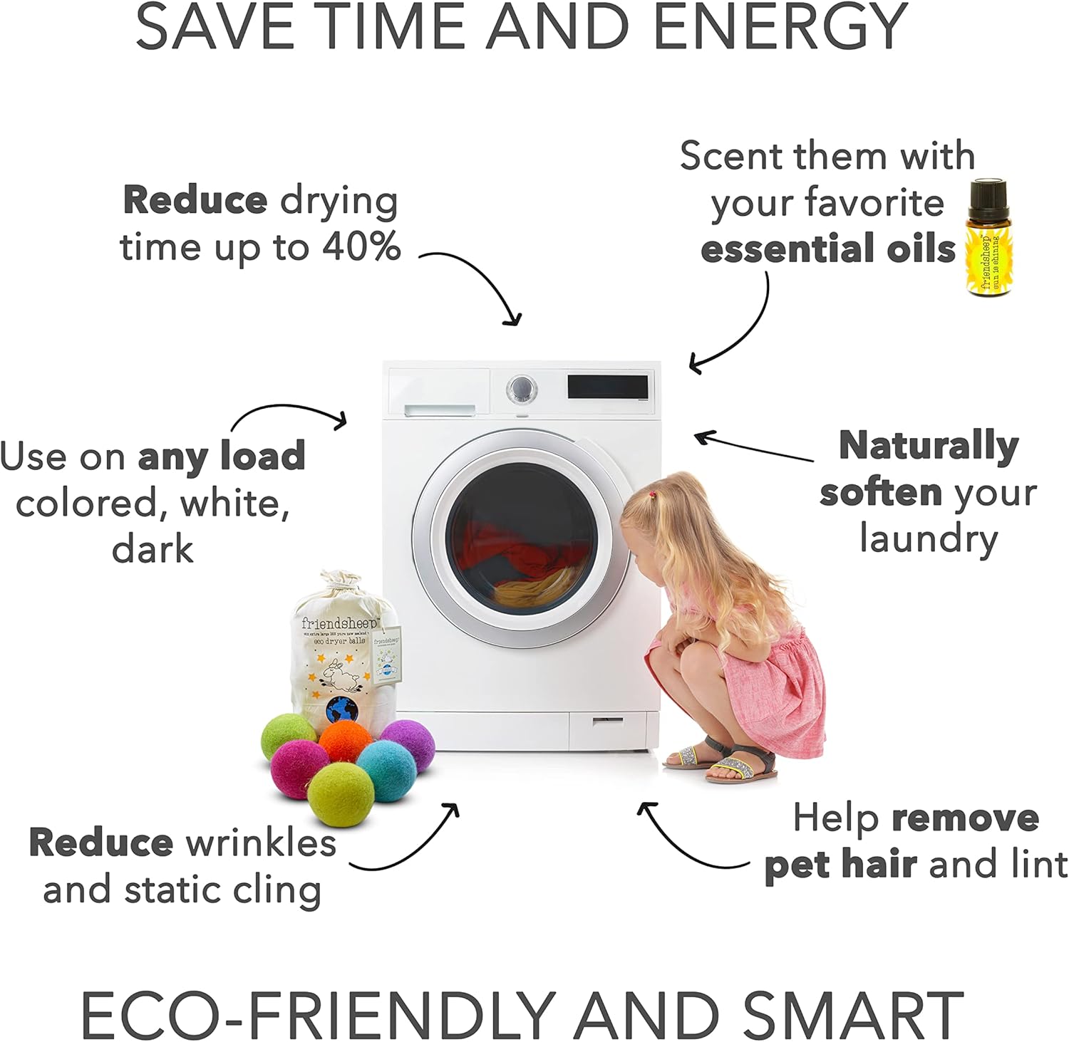 • ECO-FRIENDLY AND REUSABLE FOR 1000+ LOADS, replaces dryer sheets & liquid fabric softeners. Makes your laundry soft and fluffy, reduces wrinkles and static cling, and shortens drying time by up to 40% depending on load size. Your sheets and towels are fluffier, less balling and twisting. Makes you SAVE TIME, ENERGY, AND MONEY! All by keeping safe and healthy you, your family and the environment.