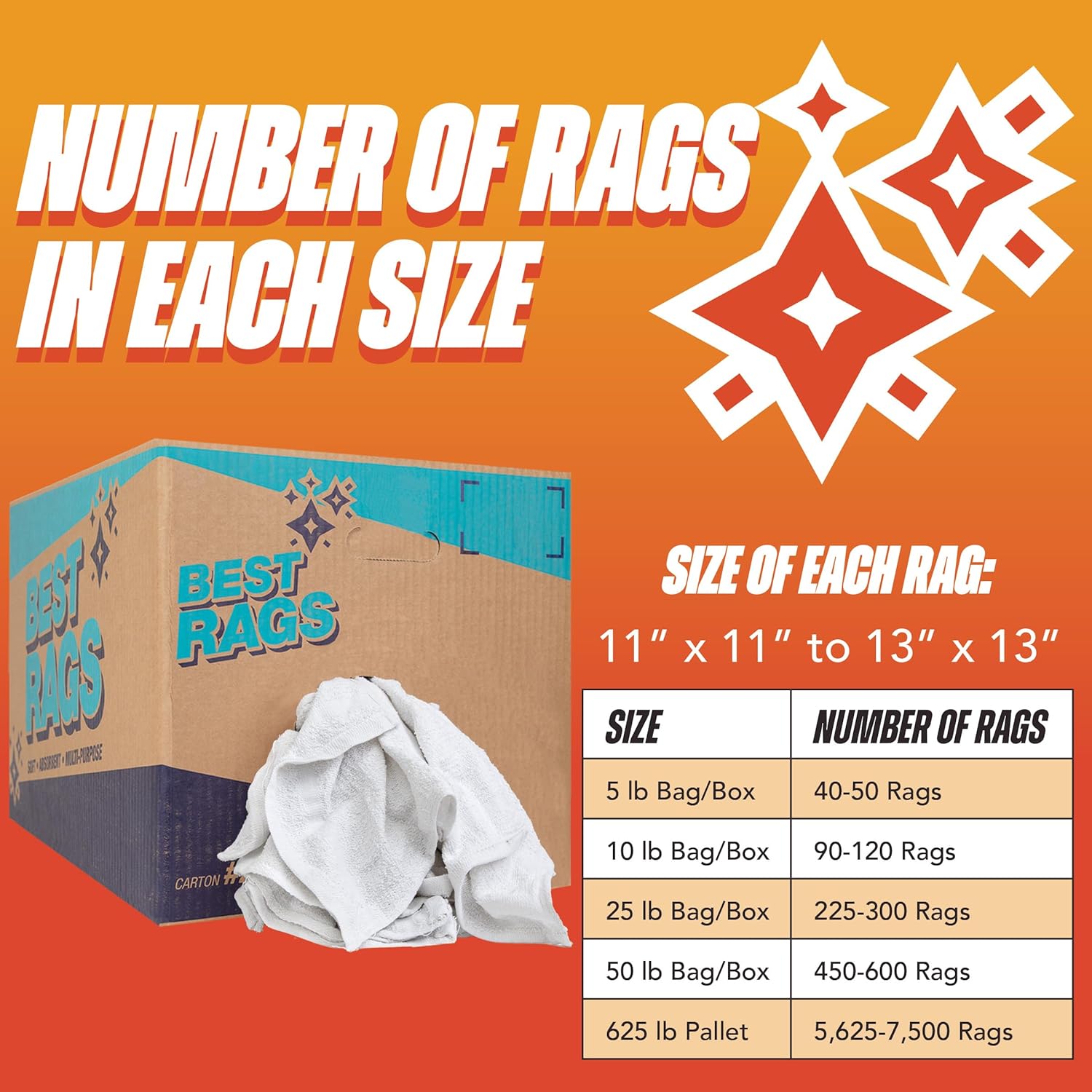• CHOOSE YOUR RAG PACK: A terry towel rag is more cost-efficient than microfiber cleaning cloths. These terry cleaning towels are available in 5lb and 10lb rag boxes for the home or office, and 25lb and 50lb rag boxes for industrial wiping, construction clean up, and remediation. Need more? We sell these cleaning wipes by the pallet when fulfilled by our warehouse.