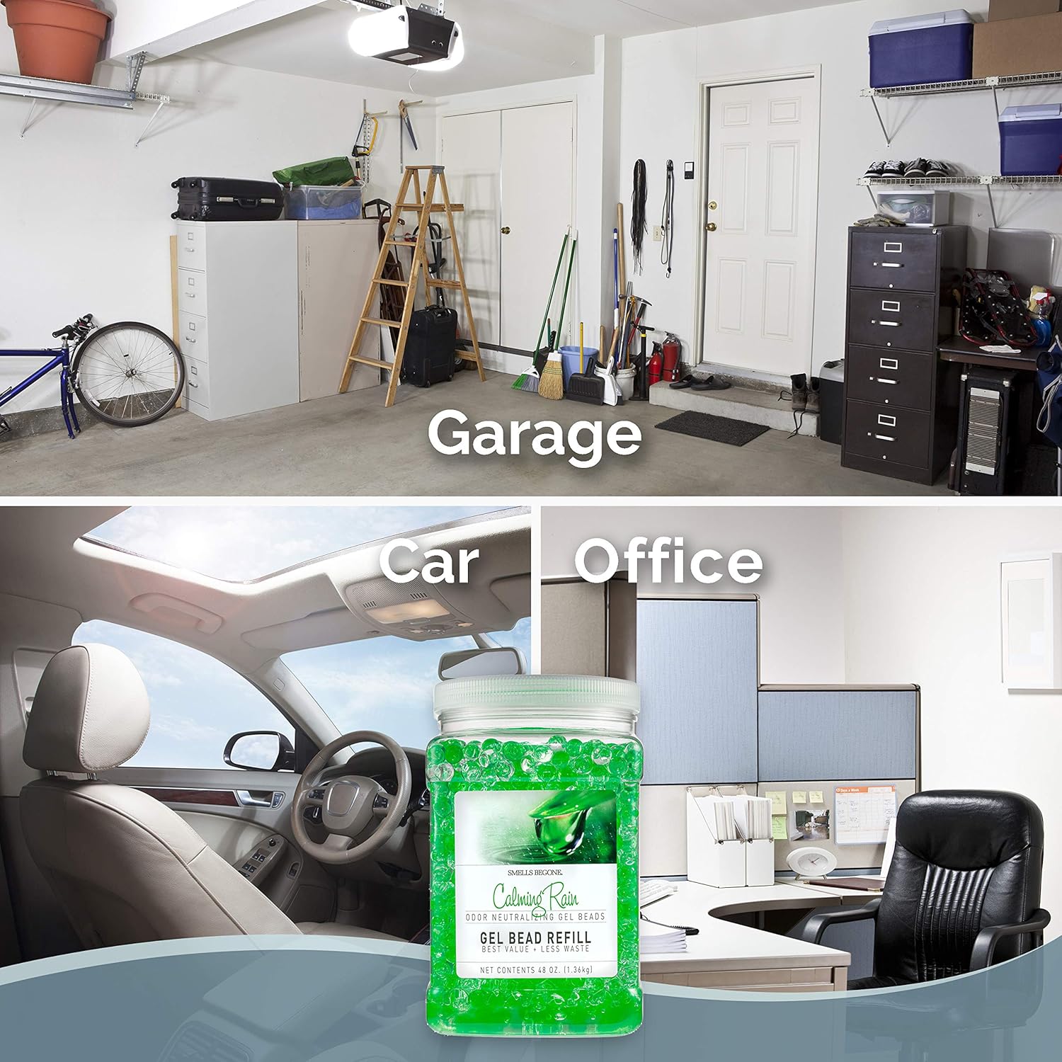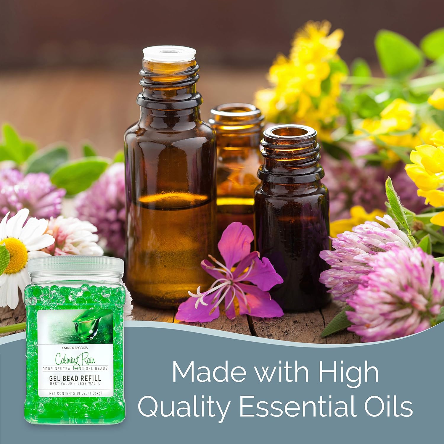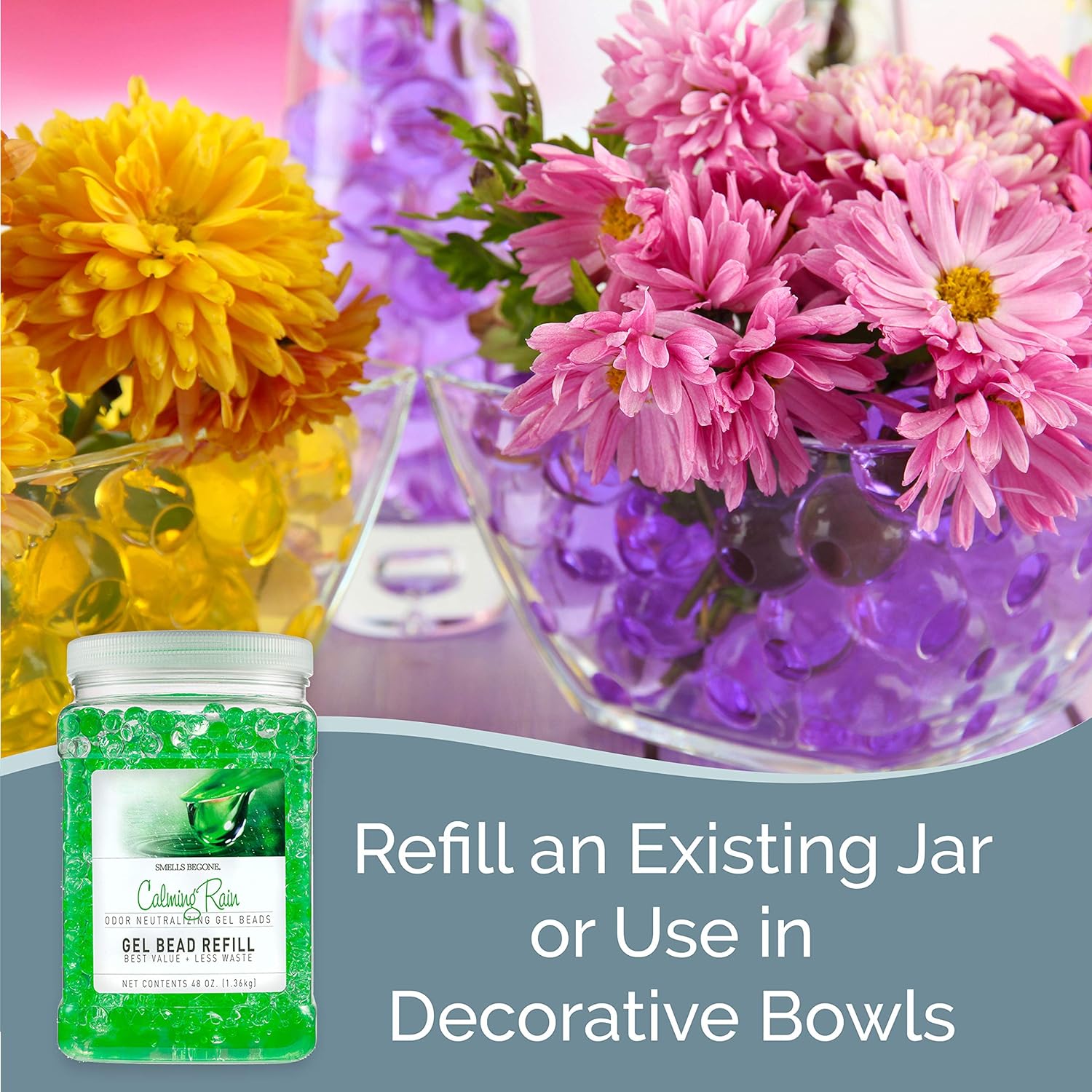 • MADE WITH ESSENTIAL OILS - Each Odor Eliminator Gel Bead jar contains 12 ounces of product and the larger refill jar contains 48 ounces of product. The products are made with plant derived ingredients and formulated with a blend of essential oil based fragrances which adds a distinct and unforgettable aroma to any area you place and use the jar.