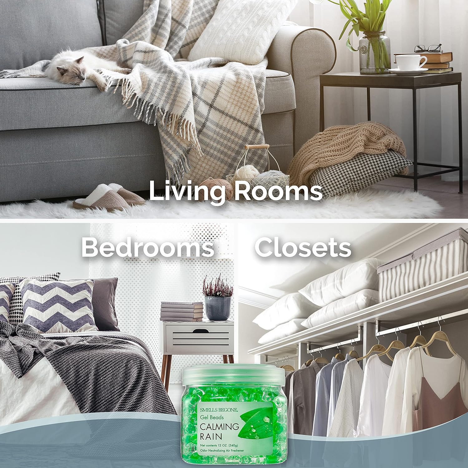 SMELLS BEGONE Odor Eliminator Gel Bead Value Pack - 72 oz - Air Freshener Eliminates Odors in Bathrooms, Pet Areas, Boats, RVs & Cars - Made with Essential Oils - Calming Rain Scent