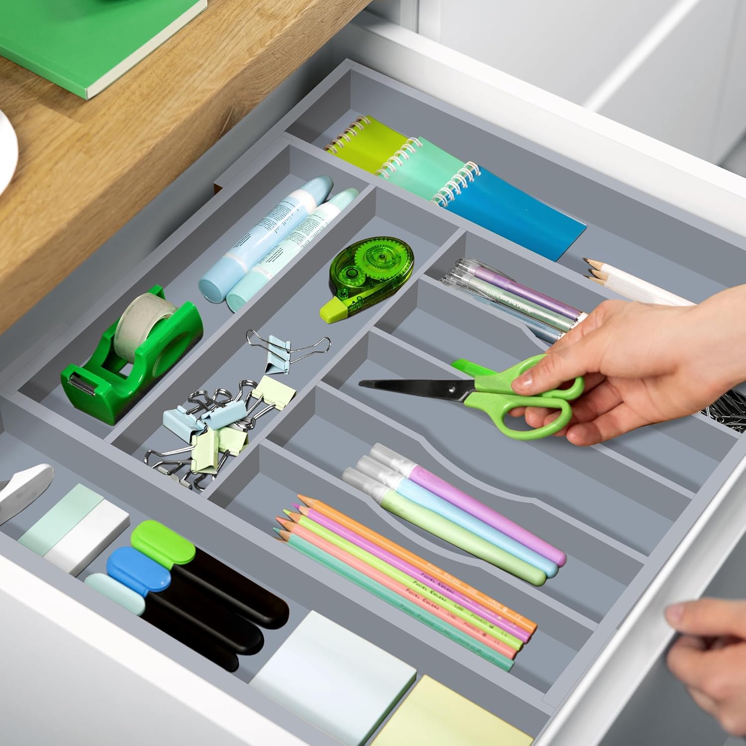 - 🔗𝐌𝐔𝐋𝐓𝐈-𝐏𝐔𝐑𝐏𝐎𝐒𝐄 𝐔𝐒𝐄: Not only is this the perfect solution for keeping your kitchen drawers spic & span, but this organizational tool is extremely versatile, suitable for placement in your office, dresser, makeup drawer, & crafting corner. Easily keep office supplies such as pencils, pens, markers, post-its, paper clips & more together in one place, and easy to grab. Neatly arrange jewelry, make-up brushes, or even paints, paintbrushes, and other art supplies, an all in one organizing solution
