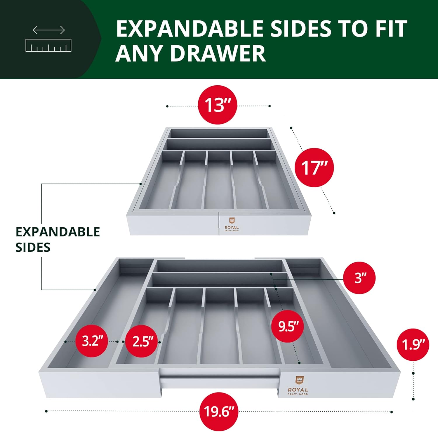- 🌿𝐄𝐗𝐏𝐀𝐍𝐃𝐀𝐁𝐋𝐄 𝐓𝐎 𝐅𝐈𝐓 𝐌𝐎𝐒𝐓 𝐒𝐓𝐀𝐍𝐃𝐀𝐑𝐃 𝐊𝐈𝐓𝐂𝐇𝐄𝐍 𝐃𝐑𝐀𝐖𝐄𝐑𝐒: Our deep bamboo drawer organizer is ideal for saving kitchen storage space, thanks to its adjustable storage drawers that expand from 17”x13” to 17x19.6” wide with 1.9” deep slots. Easy to use and ideal for helping to maximize kitchen storage space, simply pull apart from the sides for additional storage space and a more secure fit for wider drawers. Different sized compartments allow for standard silverware and large utensil placement