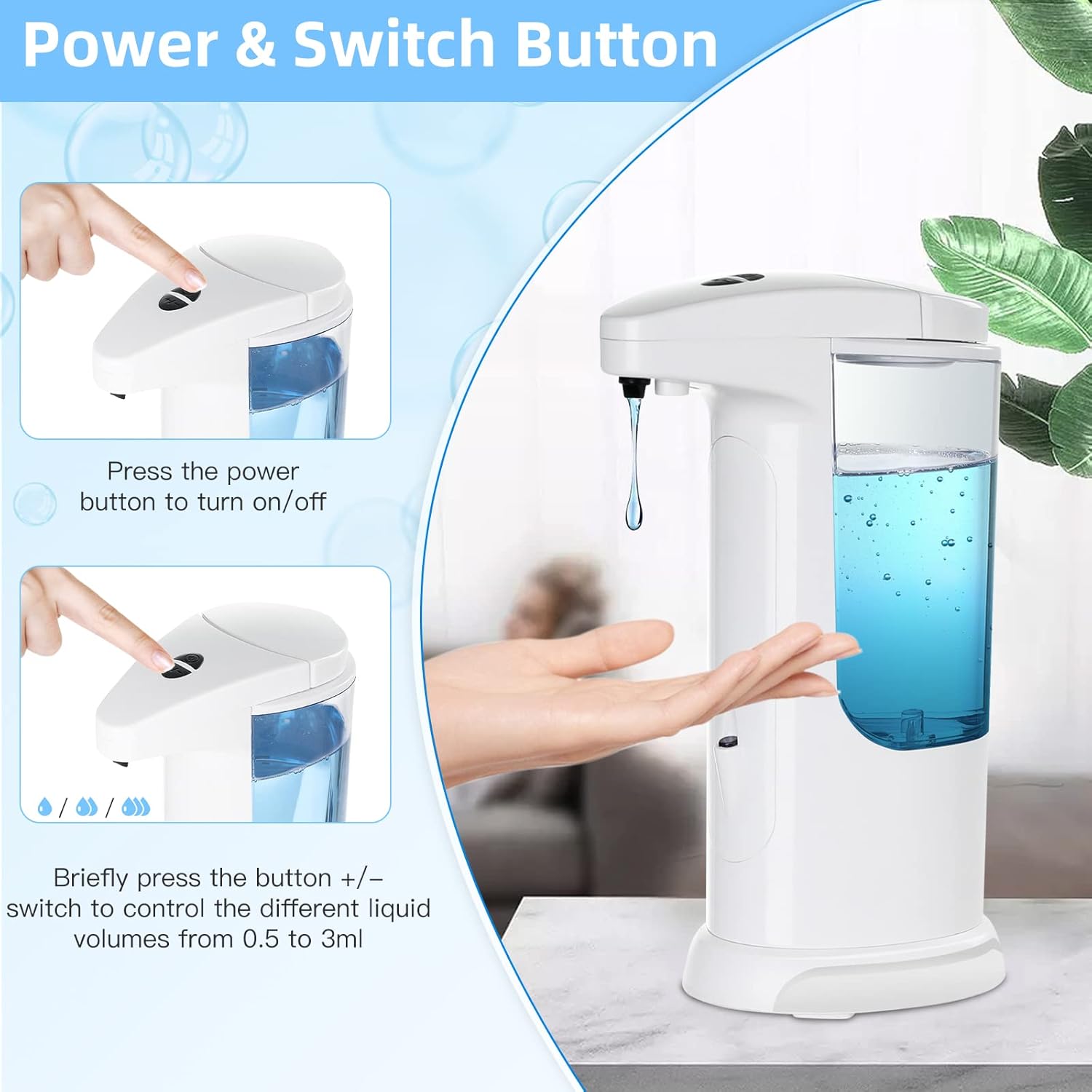 • 【Adjustable Soap Output Volume】: Features 3 different liquid dispensing volume settings, the no-touch soap dispenser allows us to set our desired volume easily by pressing the “+/-” buttons, so we make full use of the soap without waste!