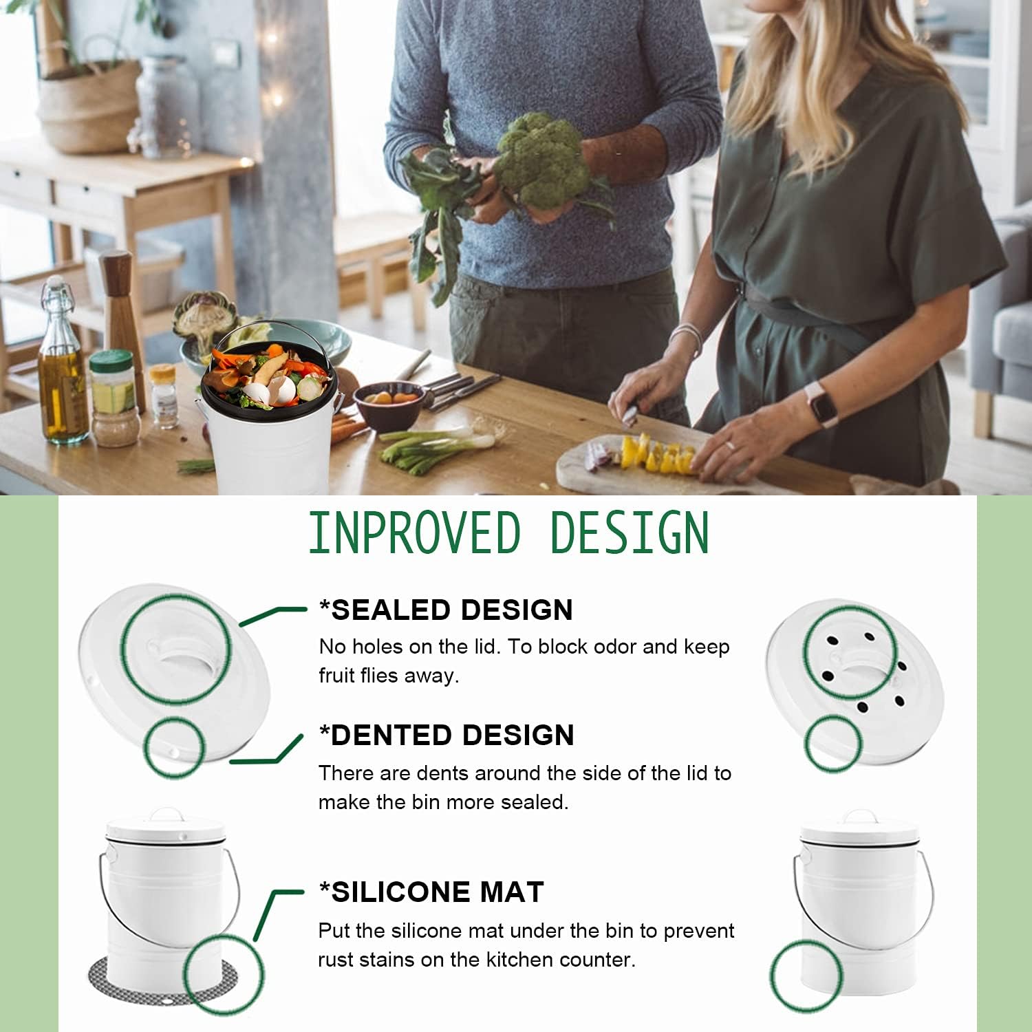 • Odor Blocking: Say goodbye to the smelly decomposing waste. Thanks to the improved sealing design of our composting bin and the charcoal filters that absorb odors inside, you can let the scraps build up for several days without worrying about attracting flies or terrible smells into your kitchen.