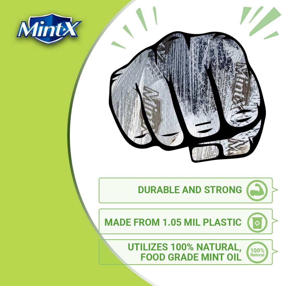 • FREE OF CHEMICALS & TOXINS: Mint-X trash bags are made with the highest quality food grade, mint essential oils to naturally and effectively keep pesky wildofe out of your trash while being completely safe for humans and pets