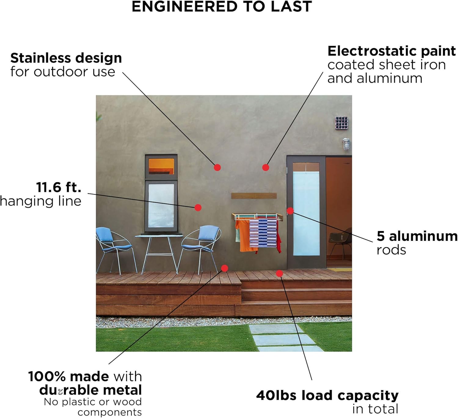 • LARGE DRYING SPACE & HEAVY WEIGHT CAPACITY: Our foldable laundry drying rack features 5 heavy-duty aluminum rods with 11.6 feet of linear hanging line and can hold up to 40 lbs weight.