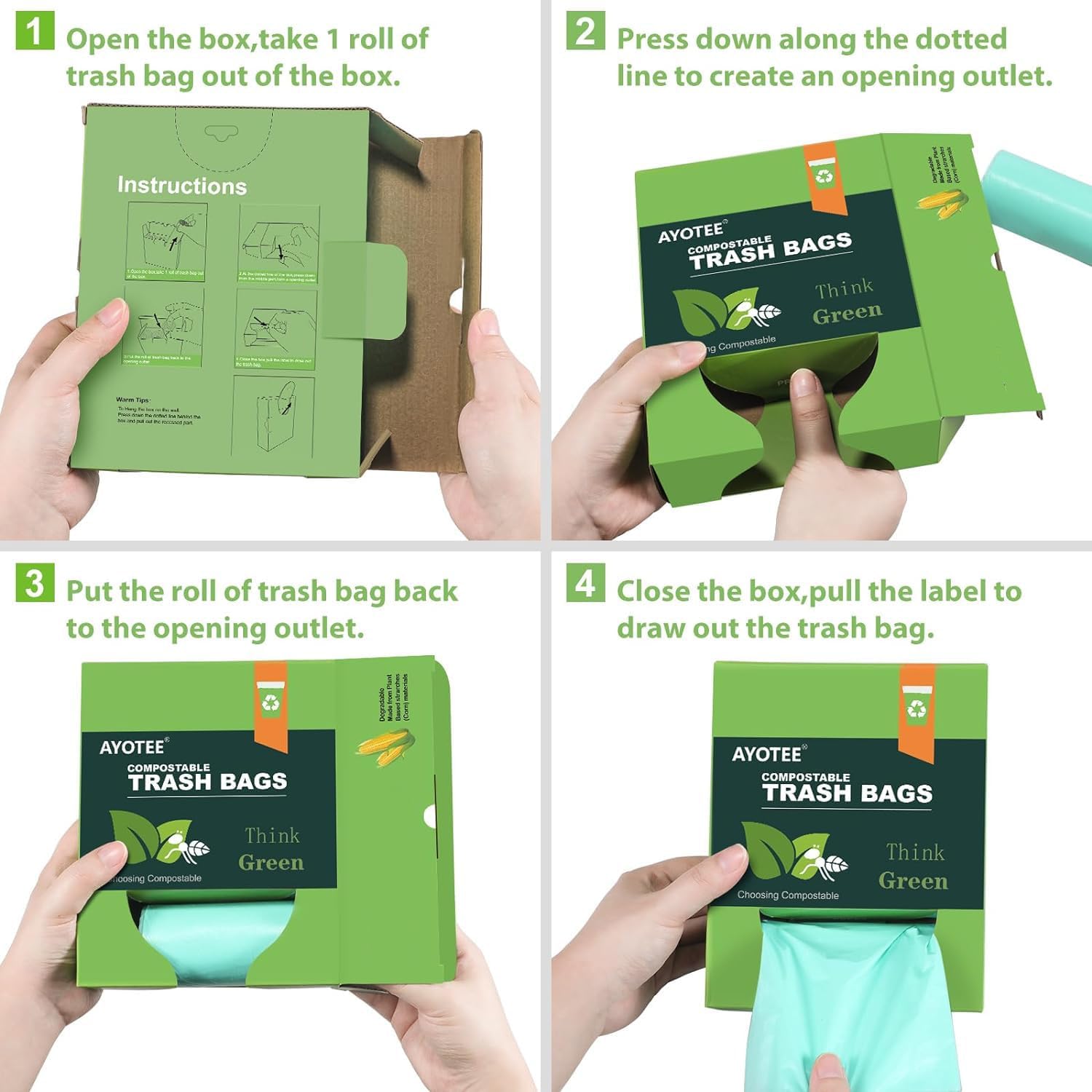 • Small Compost Trash Bags: The main materials for our small trash bags are made of plant starch extract(PSM). Certified compostable and meeting the standards of ASTM. Come in a practical box which makes it easy to draw out and store these small garbage bags Small Compost Trash Bags: The main materials for our small trash bags are made of plant starch extract(PSM). Certified compostable and meeting the standards of ASTM. Come in a practical box which makes it easy to draw out and store these small garbage bags