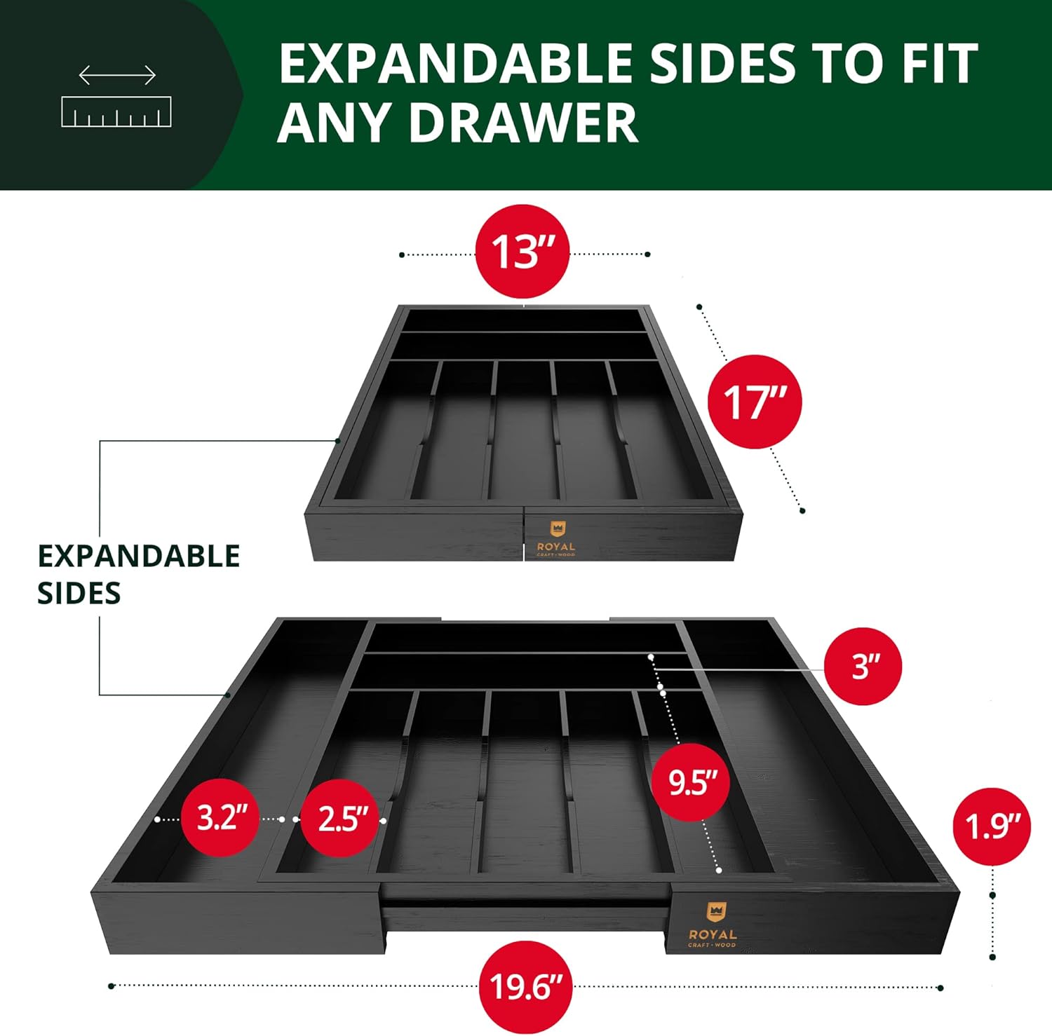 • Black utensil holder for the drawer; Royal Craft Wood bamboo expandable drawer organizer for utensils holder is perfect to keep everything in hand reach; Forget about the messy drawers now with a Royal Craft Wood; Organize your kitchen utensils, office stuff, or jewelry with a bamboo silverware drawer organizer