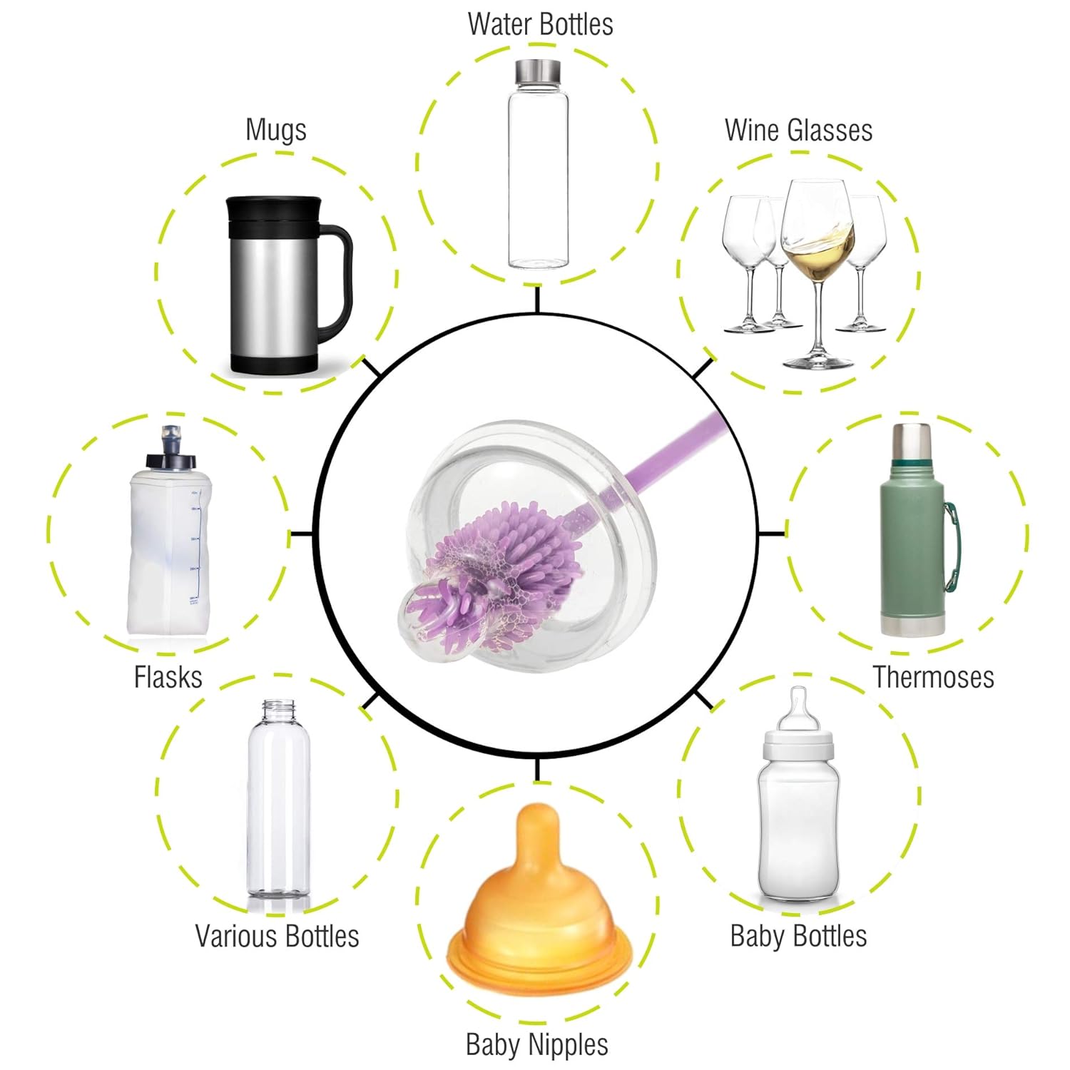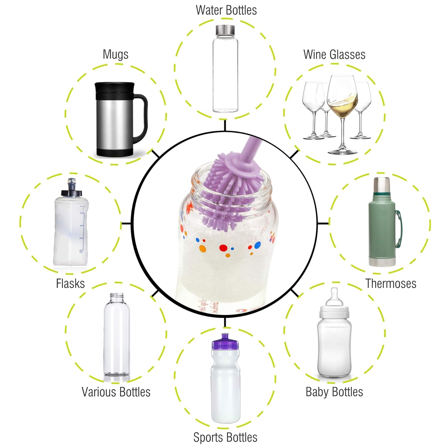 - Long Flexible Handle – Three-piece silicone bottle cleaner brush set for plastic and glass bottles. A multi-purpose dishwashing brush for kitchenware and other containers with hard-to-reach nooks and crannies such as tea/fruit infusers, flasks, coffee makers, tubes, breast pump parts, wine bottles, hummingbird feeders, baby bottles, water bottles, sports bottles, wine bottles, jar, carafes, glasses, thermoses, & much more