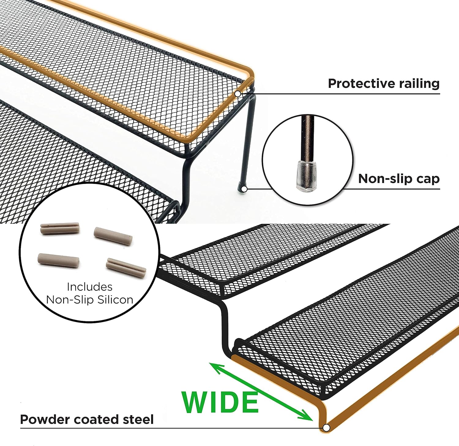 • ⭐️ [Protective Railing & Non-Slip Silicon] ➖ 0.59 inch Protective railing on each step keeps items from slip or fall off ; 4pcs NON-slip silicons prevent it from sliding or scratching surfaces.