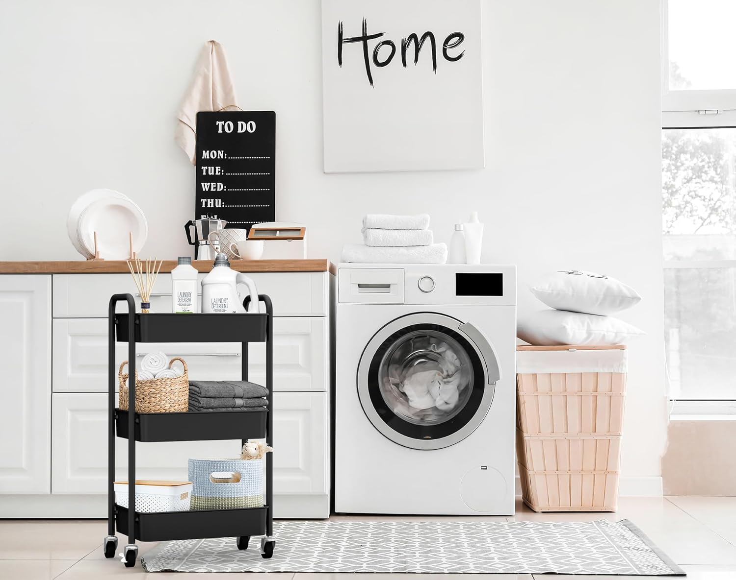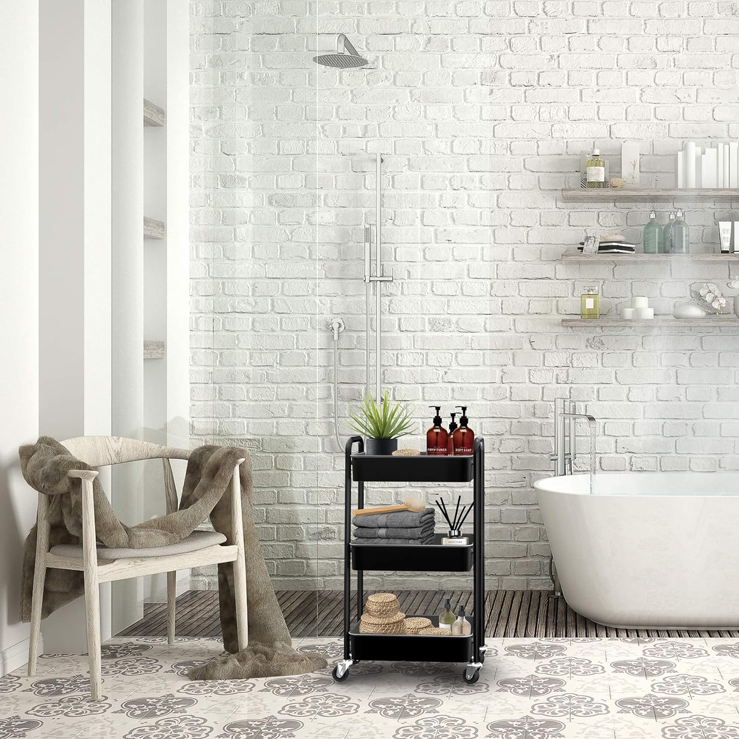 CAXXA 3-Tier Rolling Metal Storage Organizer - Mobile Utility Cart, Kitchen Cart with Caster Wheels (Black)