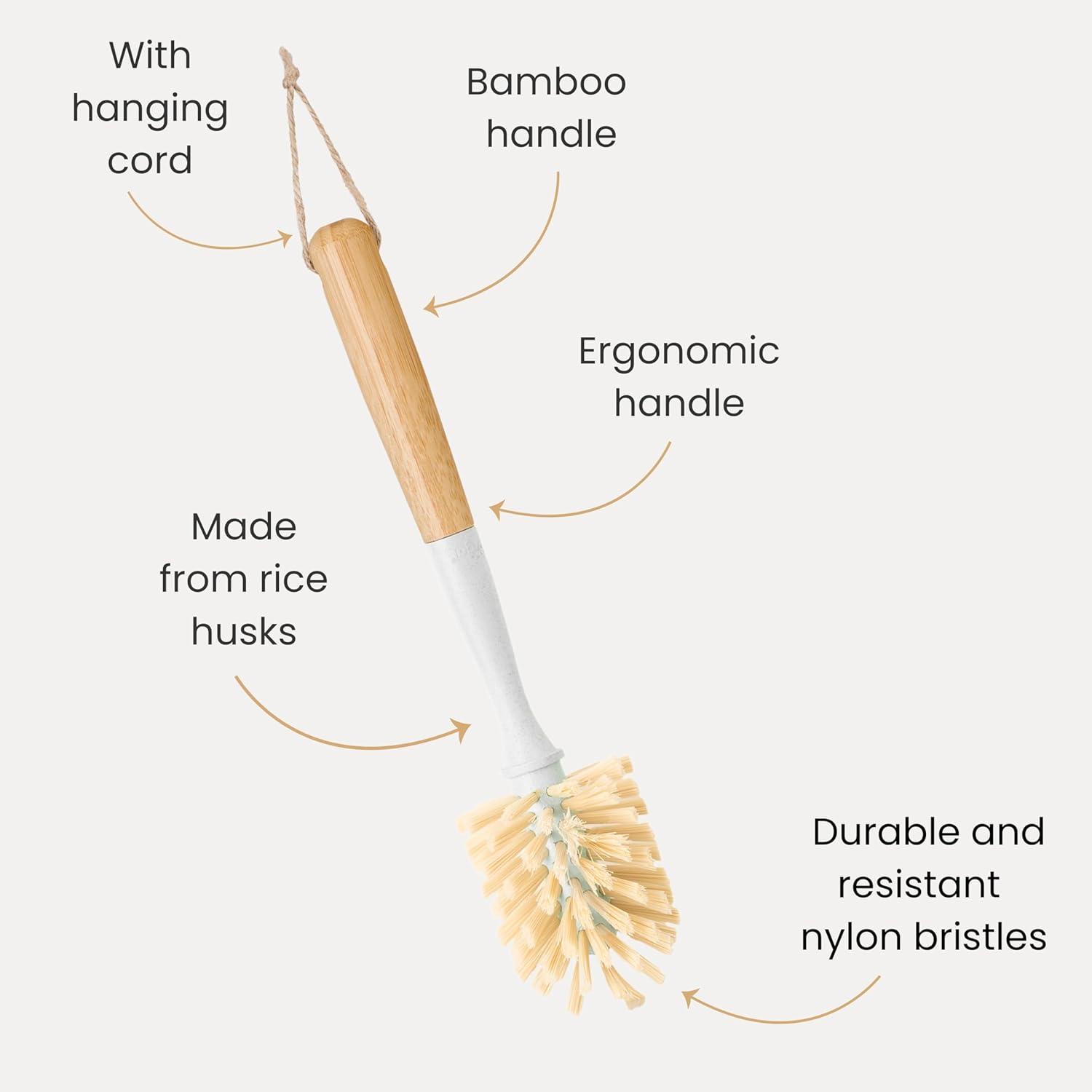 • Durable Kitchen Brush: This dish brush, made from rice husk fiber and bamboo, offers durability for everyday cleaning. It’s a reusable alternative to disposable sponges, with soft bristles that clean delicate glass surfaces gently without scratching.