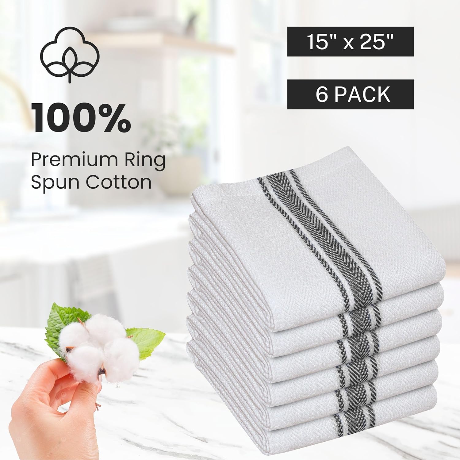 • Premium 100% Ring Spun Cotton: Crafted with soft and durable 100% ring spun cotton, these kitchen towels deliver exceptional absorbency and strength for daily kitchen tasks.