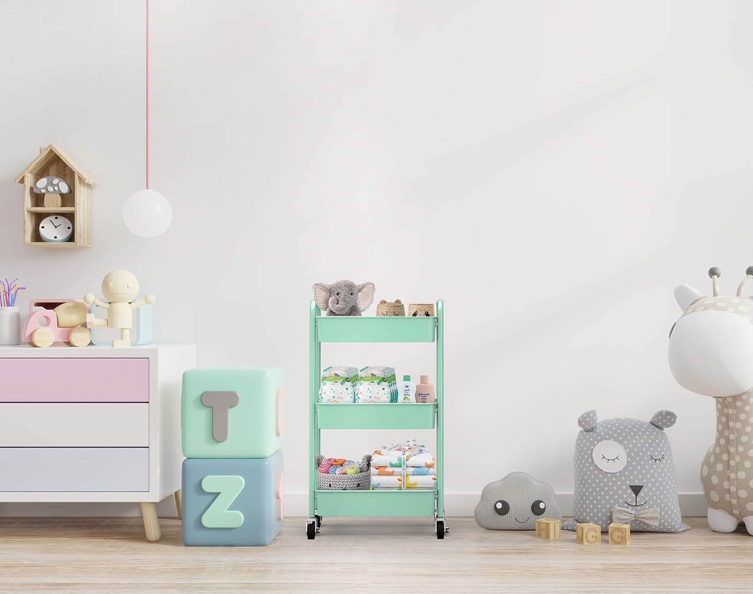 CAXXA 3-Tier Rolling Metal Storage Organizer - Mobile Utility Cart, Kitchen Cart with Caster Wheels (Aqua Green)