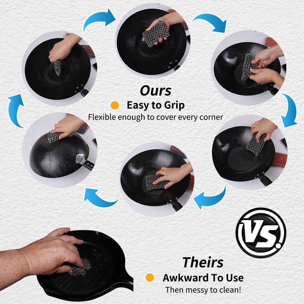 • 【How to clean a skillet?】Scrub the cast iron, skillet,and other stubbon built up,grease under warm water, rinses with clean water then let it dry. Convenient hanging ring on this cast iron pan cleaner chainmail scrubber allow easy storage. 6 Colors available.