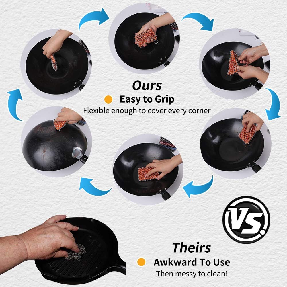 • 【How to clean a skillet?】Scrub the cast iron, skillet,and other stubbon built up,grease under warm water, rinses with clean water then let it dry. Convenient hanging ring on this cast iron cleaner chainmail scrubber allow easy storage. 6 Colors available.