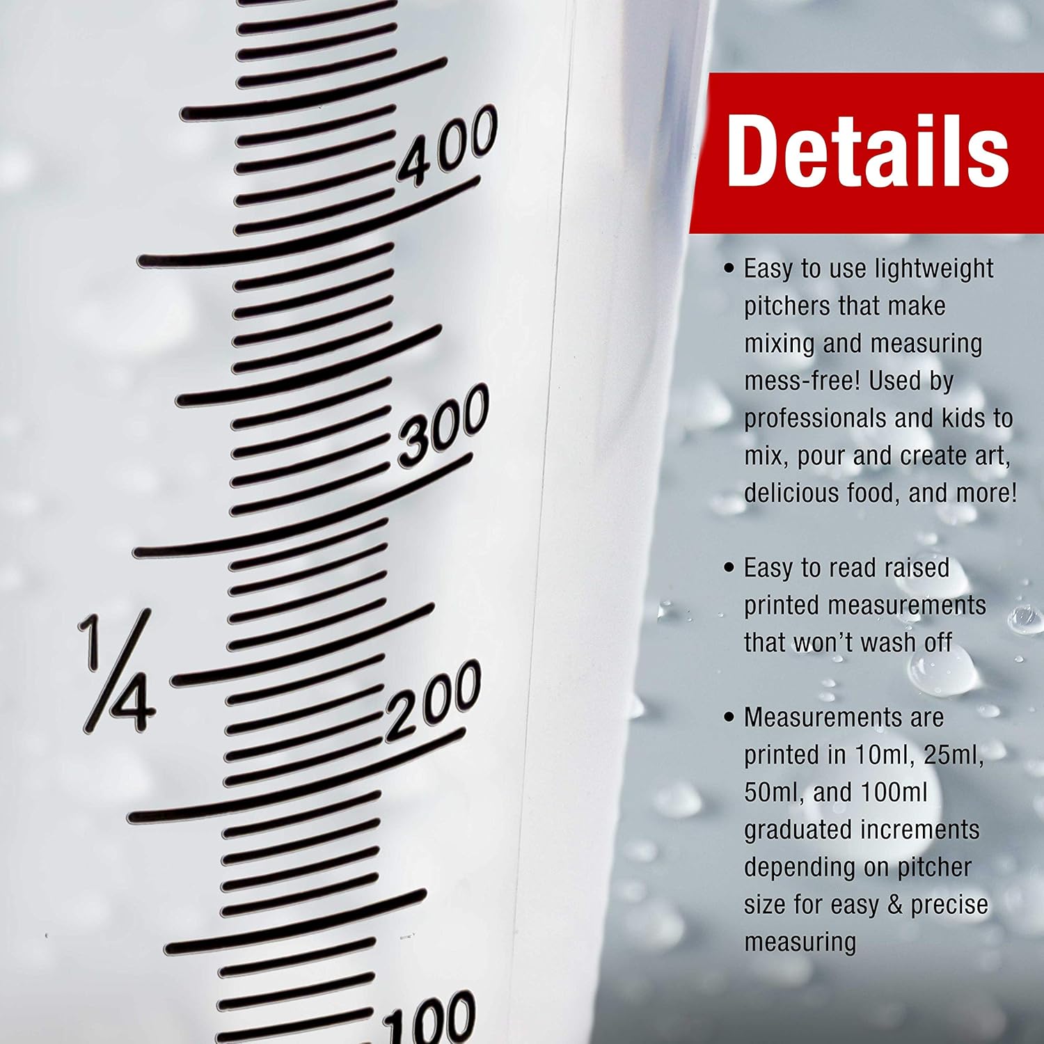 • Easy to use lightweight pitchers that make mixing and measuring mess-free! Used by professionals and kids to mix, pour and create art, delicious food, and more!