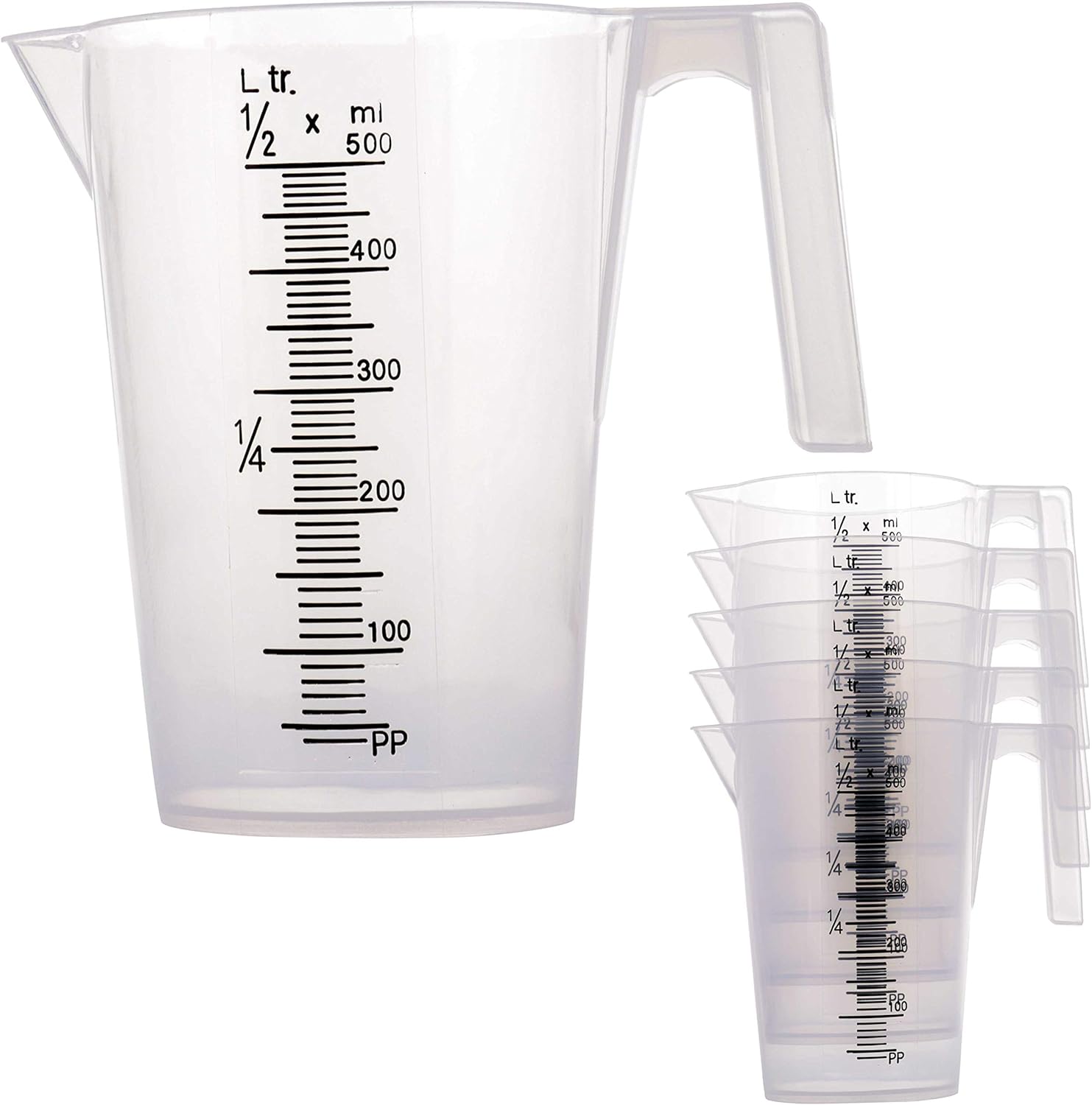 TCP Global 1/2 Liter (500ml) Plastic Graduated Measuring and Mixing Pitcher (Pack of 6) - Holds Over 1 Pint (16oz) - Pouring Cups, Measure & Mix Paint, Resin, Epoxy, Kitchen Cooking Baking Ingredients