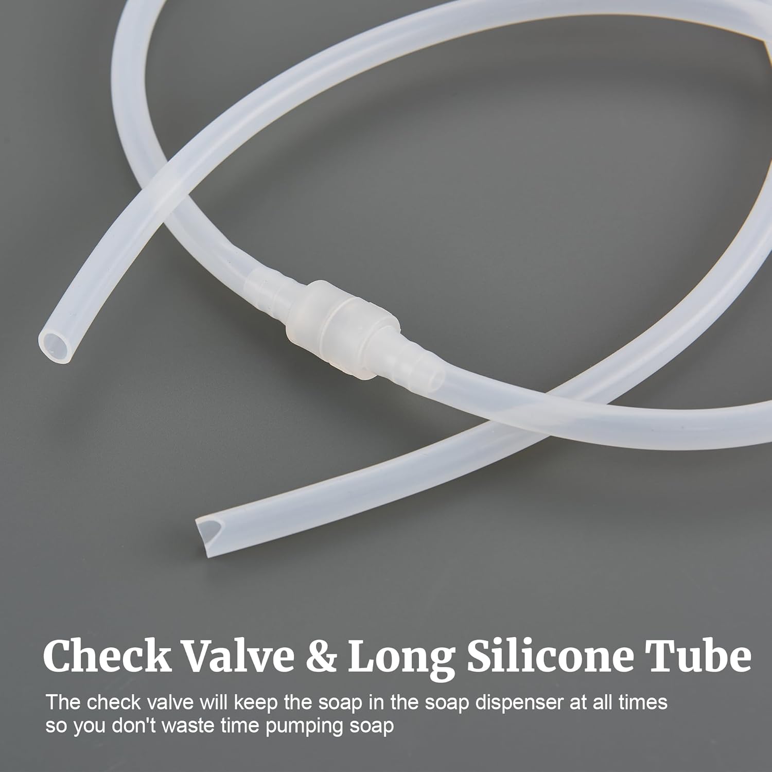• WHAT YOU GET: A stylish and great soap dispenser pump, two bottle stoppers to your soap containers, 40” silicone tube with a check valve which can connect to your bottle directly, a detailed installation instructions