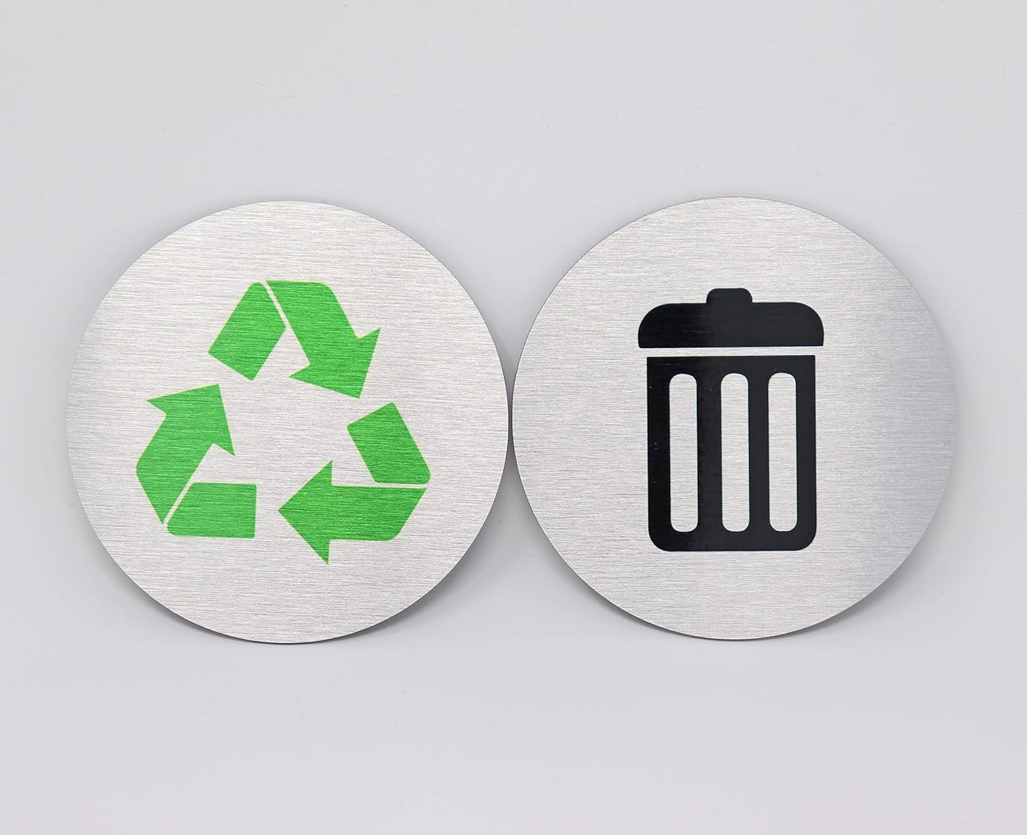 • UNBEATABLE VALUE - Our 3” round, brushed silver aluminum signs are designed for long lasting quality in the kitchen, office, or at home. These high-grade INDOOR trash and recycling signs provide an affordable and durable option that will outlast any sticker alternative.