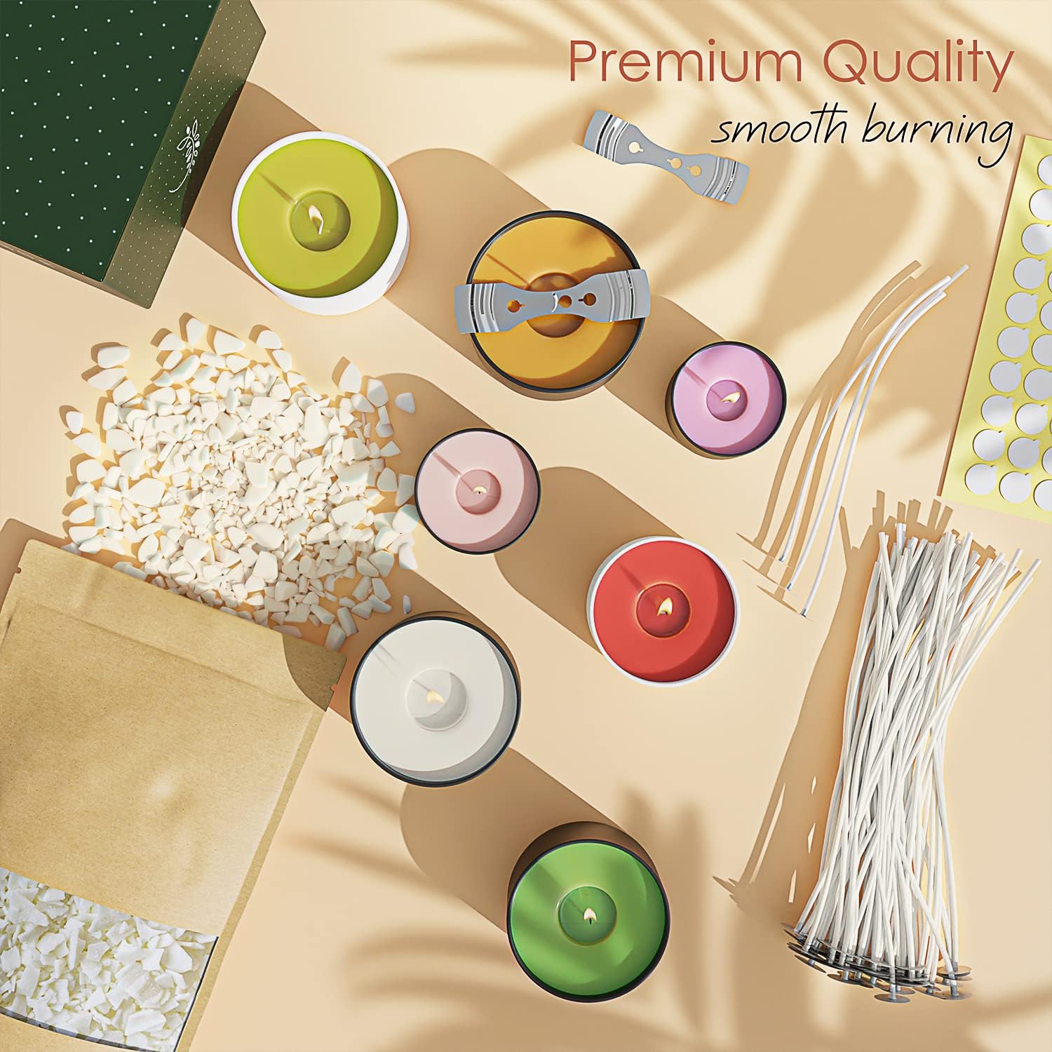 • SOY CANDLE MAKING KIT FOR ADULTS: Make your own candles with our candle making supplies kit: natural soy wax for candle making 8 lb bag, 100 cotton candle wicks for candle making, 100 candle wick stickers, 2 wick holders.
