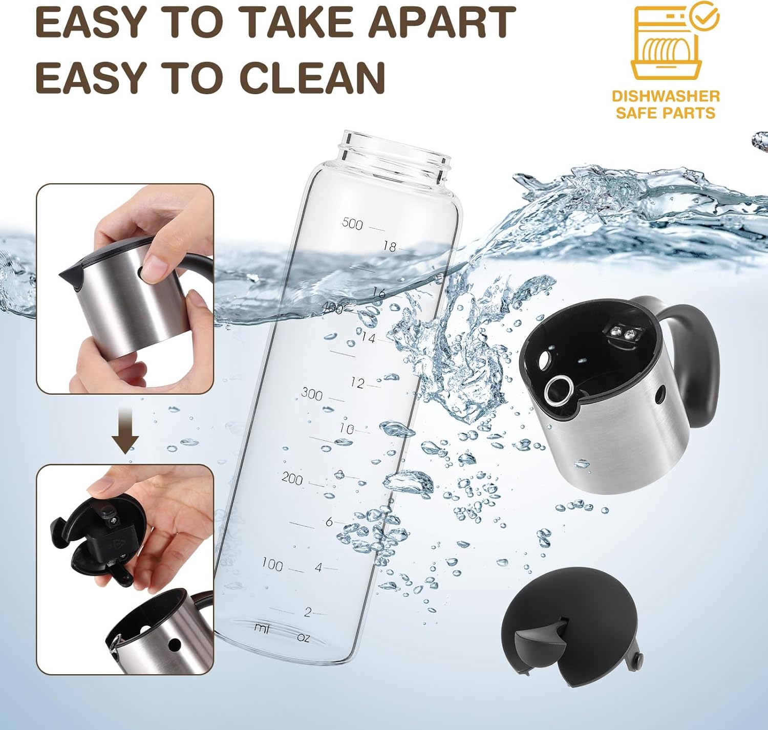 • No-Drip Spout & Leakproof Oil Bottle - Unique spout with clear measurements labeled on the glass bottle to greatly avoid dripping and you can better control the amount of oil and no worry about over dressing. Non-Drip Spout, keep your hands and the oil kitchen dispenser clean. There are two different capacity 10oz and 18 oz, they can meet your different needs.