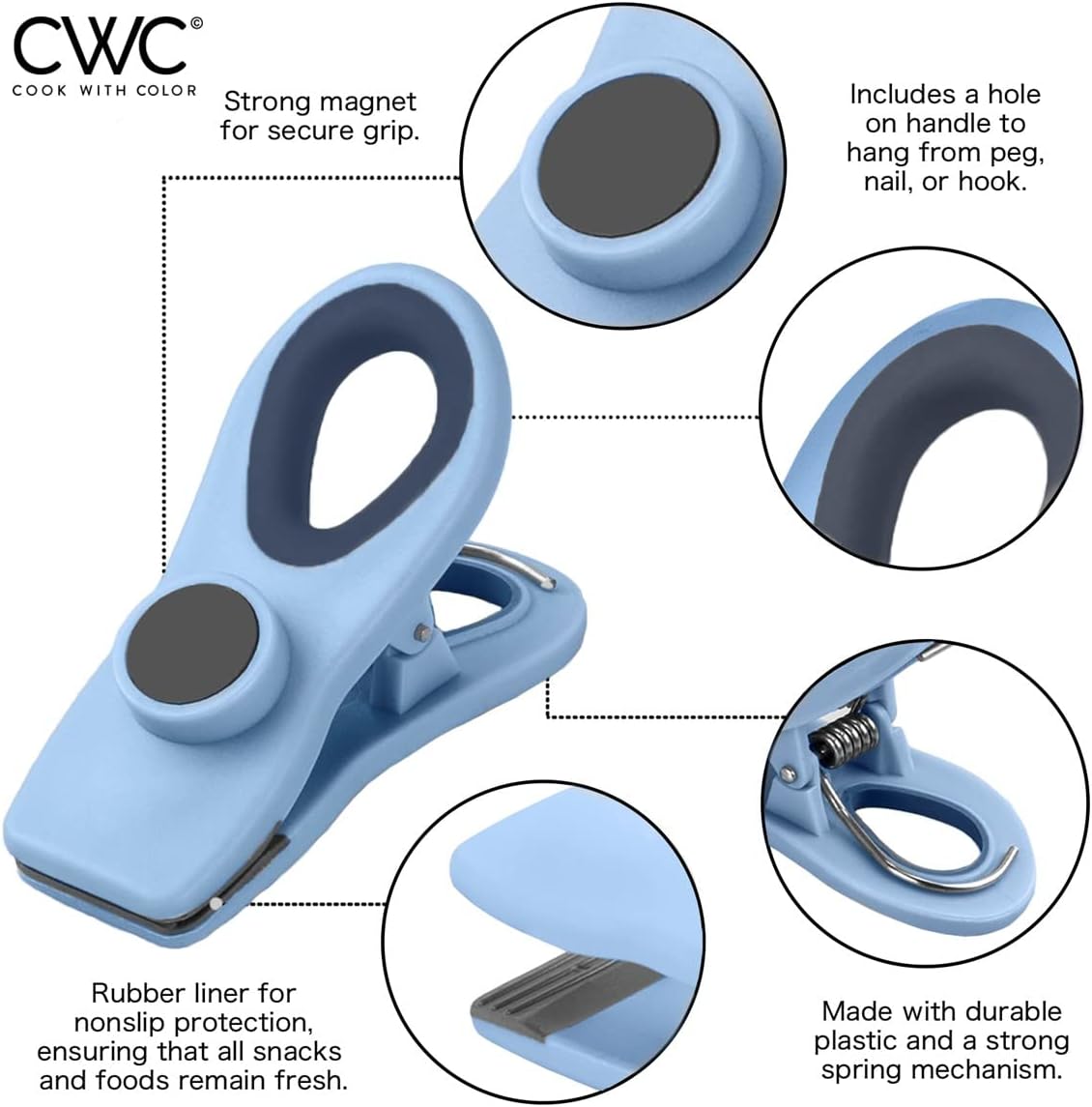 • Bag clips are one of those things you never have enough of; Invest in a set of durable, long lasting, soft touch, kid friendly Cook with Color food bag clips and organize your home and office with a colorful set of spring clips