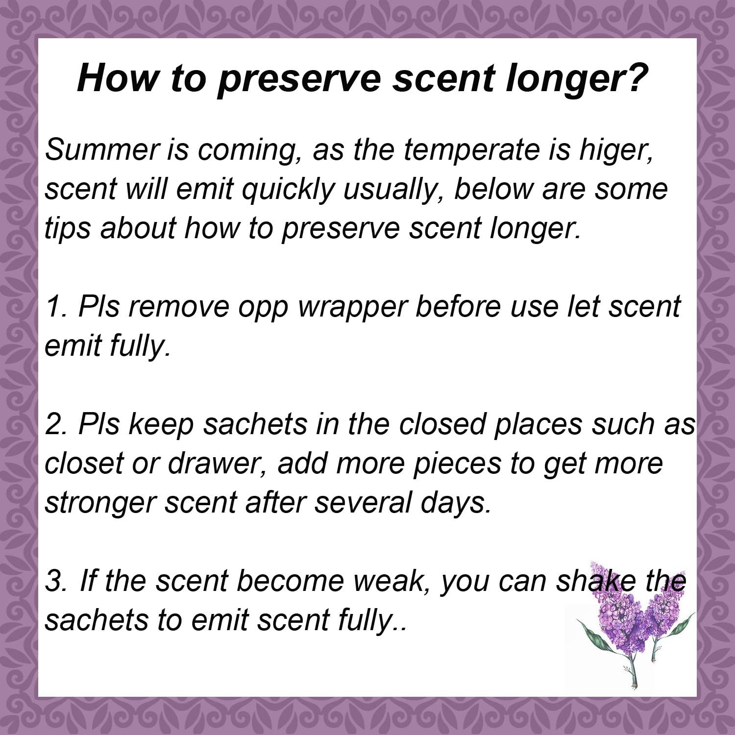 • Enjoy Life with Sweet Aroma: It is better to put our scented sachet packets in closet places in order to preserve scent longer. So just place these closet sachets to closet, drawer, cars, suitcase and handbags to let your life be filled with perfect sweet fragrance, always keep a good mood.sachet bags scented can be used for aroma therapy to nourish and stimulate the body and soul, let you feel calming and relaxing.