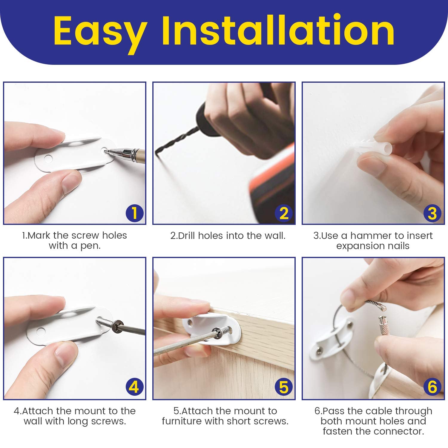 • EASY TO INSTALL: Using a screwdriver and drill driver can quickly install the anti-tip furniture anchors in minutes. The heavy duty baby proofing kit includes all necessary hardware and supports vertical or horizontal mounting for different furniture;