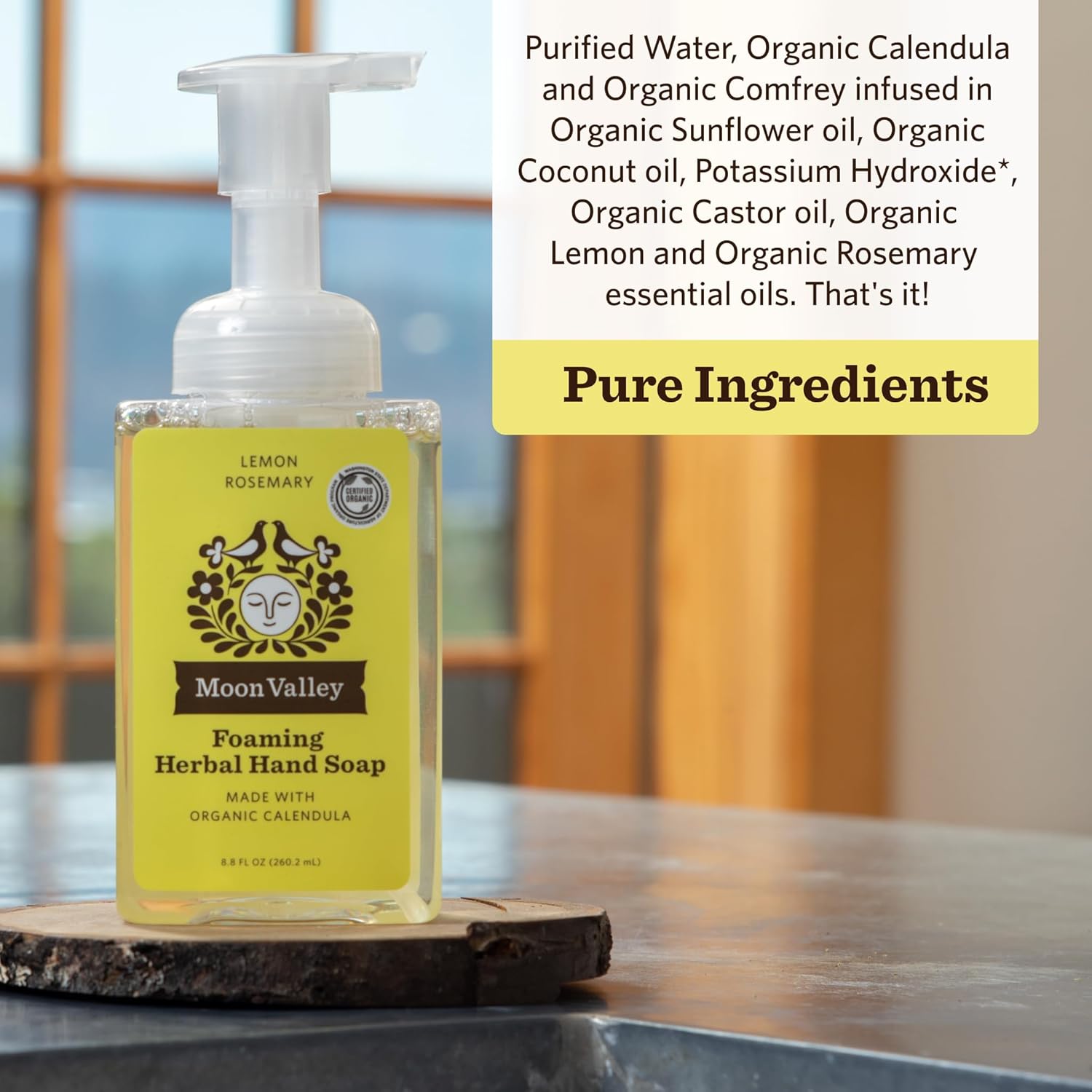 • TWO-PACK: This bundle of two 8.8oz Foaming Hand Soaps includes fresh and natural scents of Lemon Rosemary. Moon Valley Organics Herbal Foaming Hand Soaps are certified organic, vegan and non-gmo. Each bottle is recyclable. Ingredients leave hands soft and moisturized.