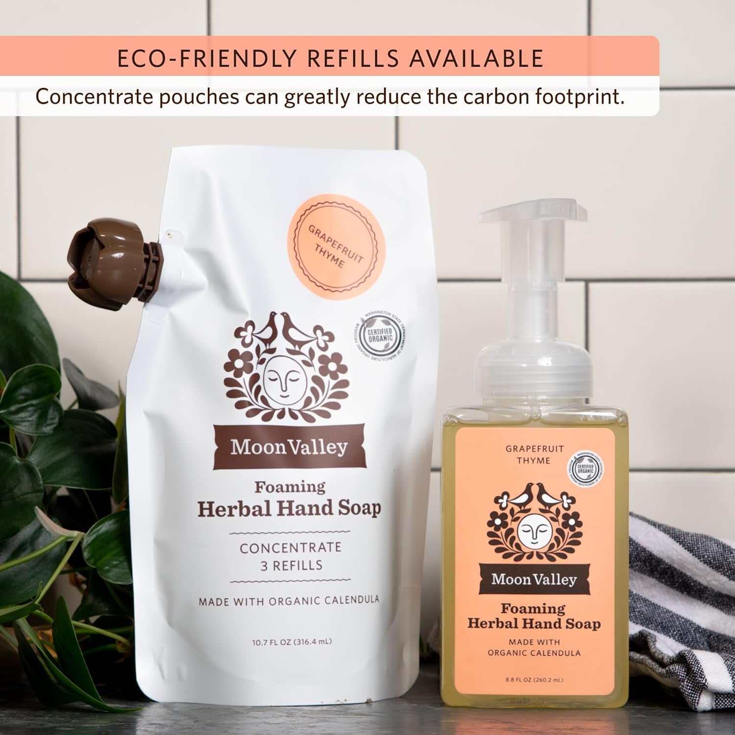 • TWO-PACK: This bundle of two 8.8oz Foaming Hand Soaps includes fresh and natural scents of Grapefruit Thyme. Moon Valley Herbal Foaming Hand Soaps are certified organic, vegan and non-gmo. Each bottle is recyclable. Ingredients leave hands soft and moisturized.