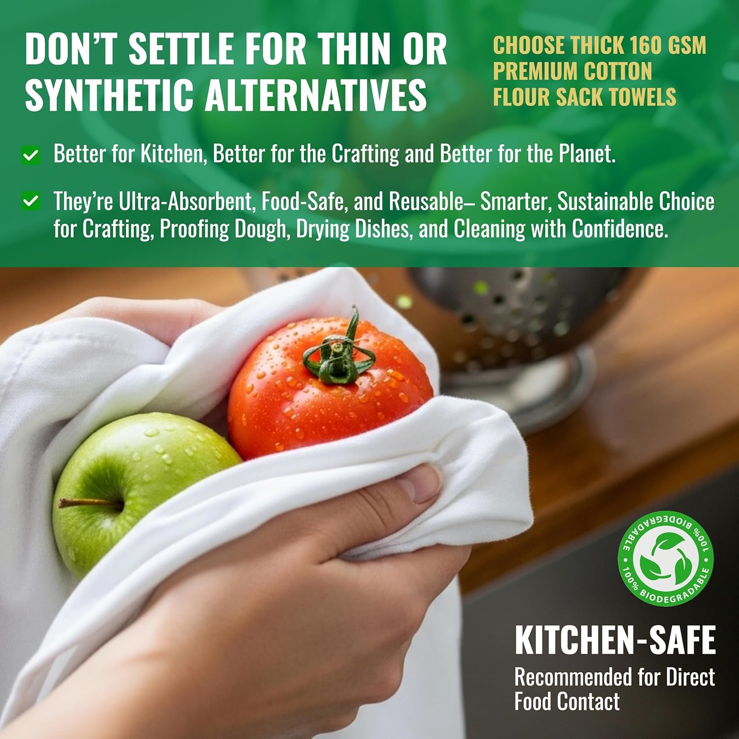• ✅ 100% Natural Cotton – Safe for Food and Family Use Crafted from unbleached, chemical-free premium cotton, these lint-free towels are perfect for food preparation, and eco-conscious living. An ideal choice for anyone looking for “premium dish towels” or “eco-friendly flour sack towels.”