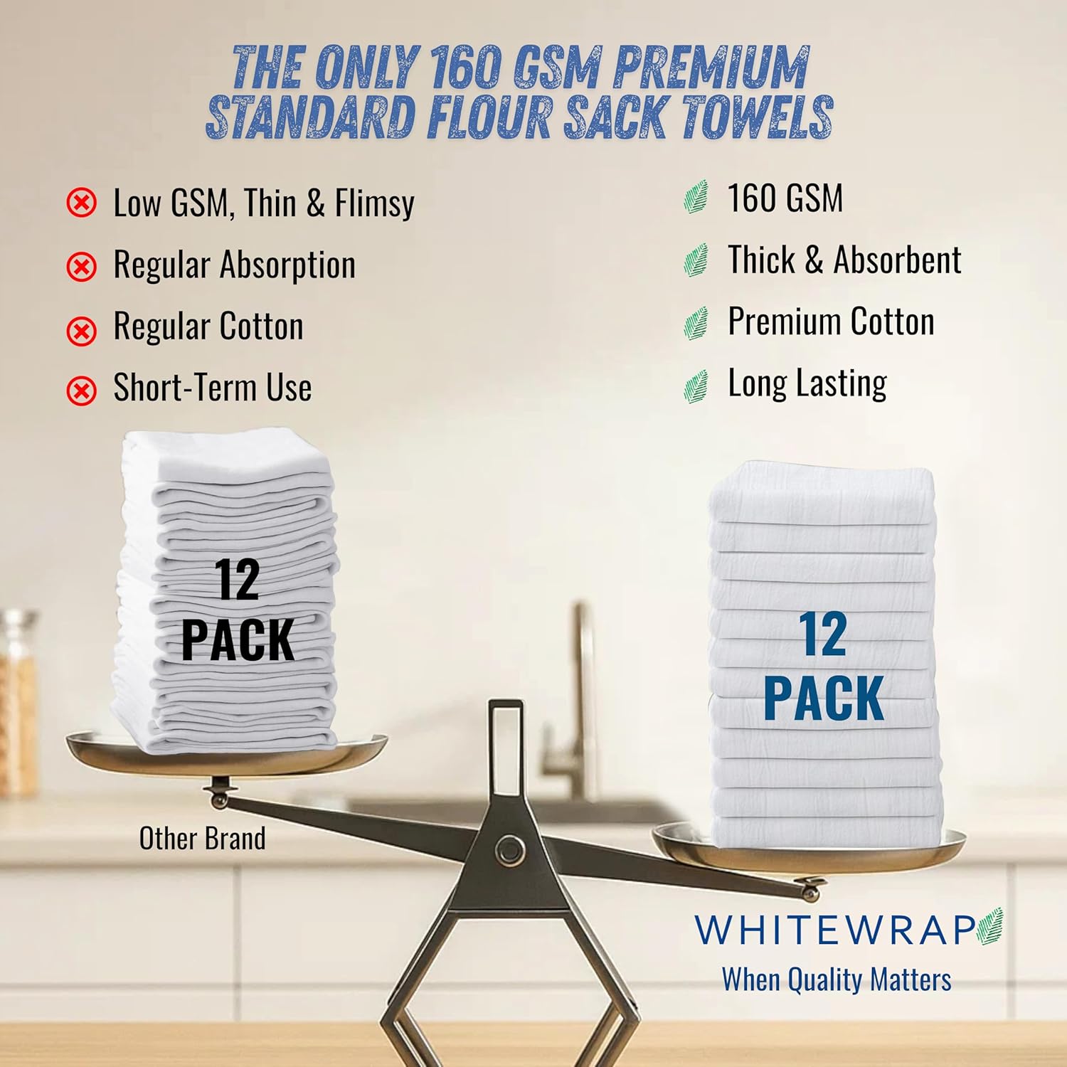 • ✅ Ultra-Thick 160 GSM Flour Sack Towels – Kitchen-Grade Absorbency Tired of thin, ineffective towels? WHITEWRAP’s high-density 160 GSM flour sack towels, made from 100% ring-spun cotton with a 130 thread count, offer exceptional thickness and ideal for drying dishes, wiping, and tough kitchen tasks.