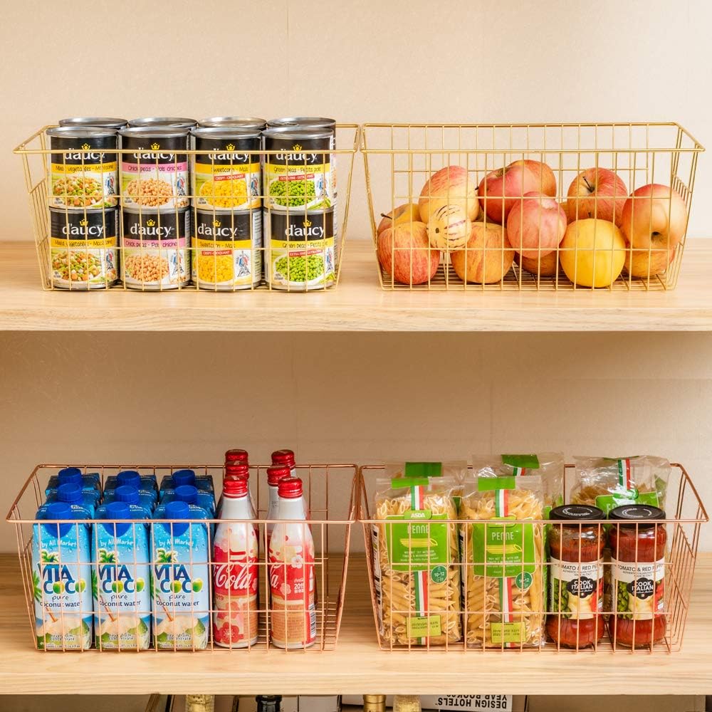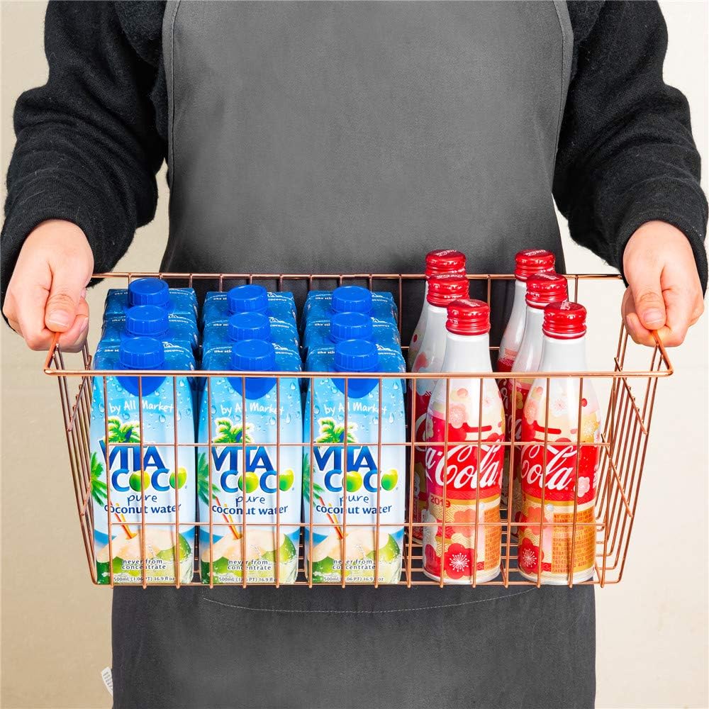 SANNO Wire Storage Basket, Farmhouse Pantre Freezer Baskets bins Metal Baskets Kitchen Storage Organizer Bin for Pantry, Shelf, Freezer, Kitchen Cabinet, Bathroom, Rose Gold