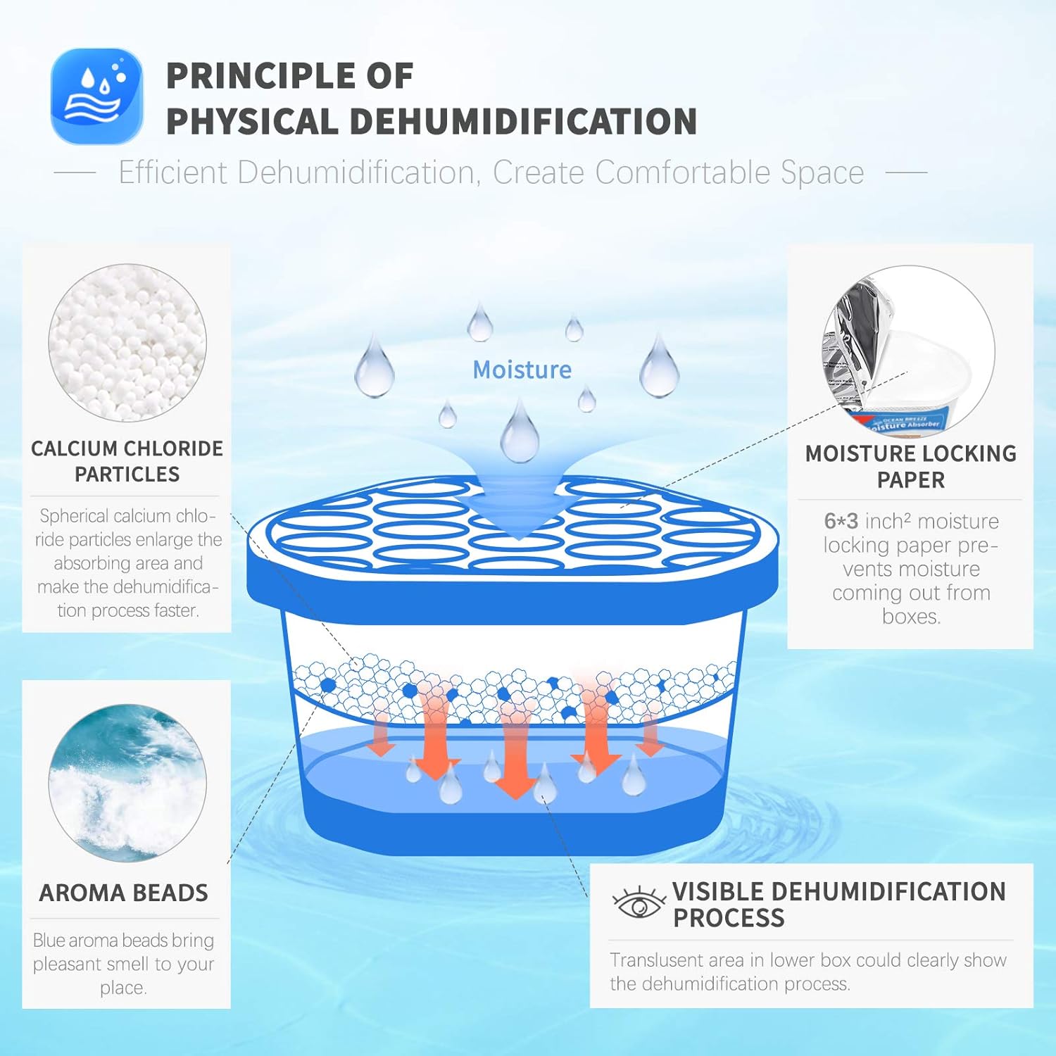 Vacplus Moisture Absorbers 6 Pack, 10.5 Oz Portable Humidity Absorber Boxes for Your Bathroom, Closet & Car, Dehumidifier with Ocean Fragrance, Light Blue