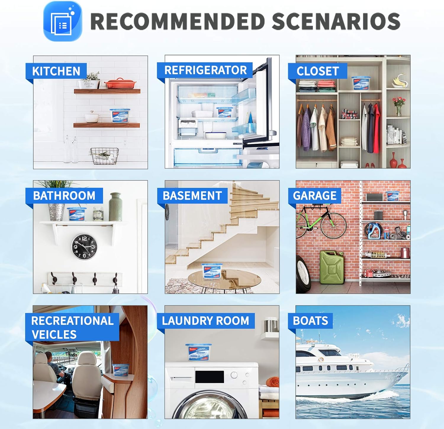 • Free Your Nose : Vacplus moisture removers with ocean fragrance could eliminate musty smell while releasing the pleasing fragrance at the same time. This safe moisture absorber is definitely a portable odor absorber for homes, closets, bathrooms, kitchens, laundry rooms, touring cars, shoe cabinets, boats, and closed spaces.