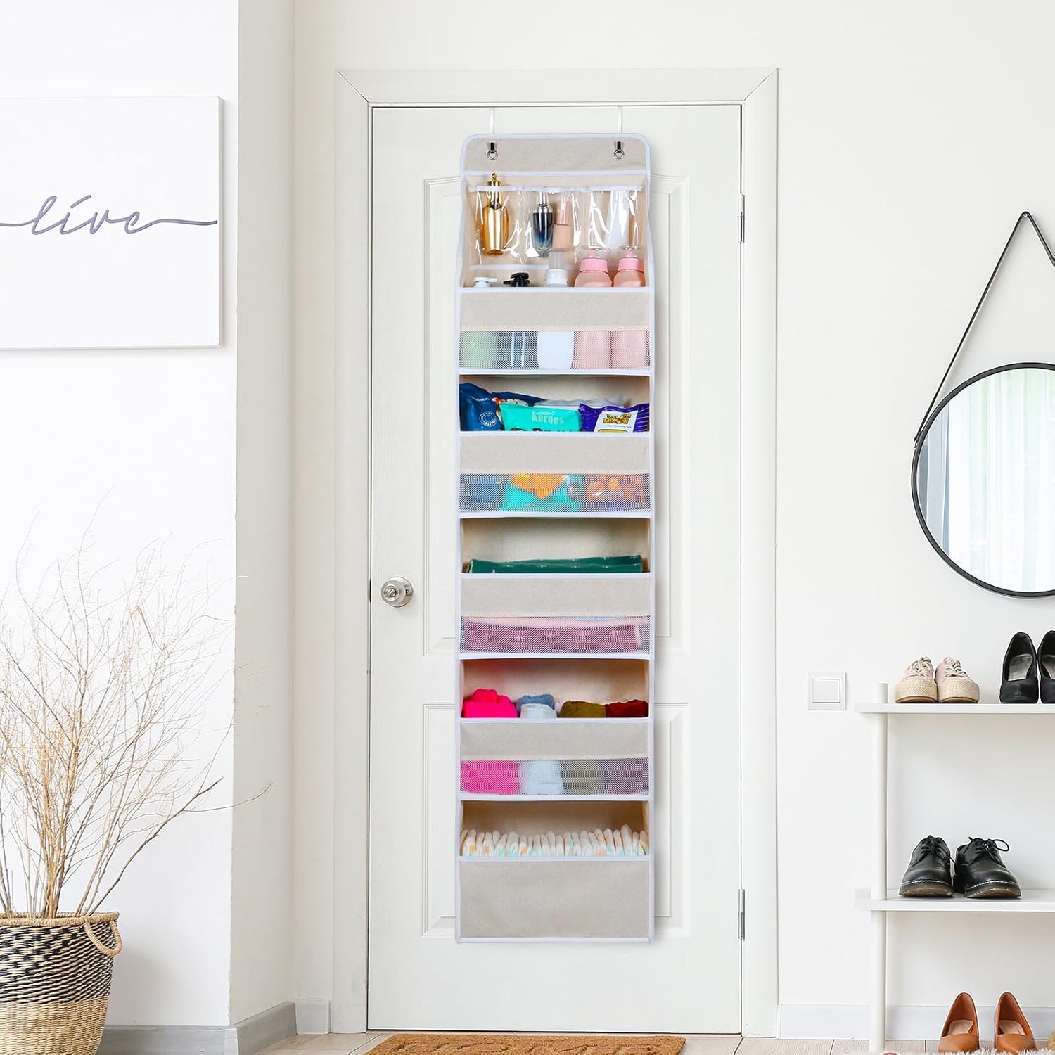 Univivi 6-Shelf Over Door Hanging Organizer Fabric Baby Door Storage with 5 Large Pockets and 3 Small PVC Pockets Wall Mount Hanging Storage Organizers for Baby Essential (Beige)