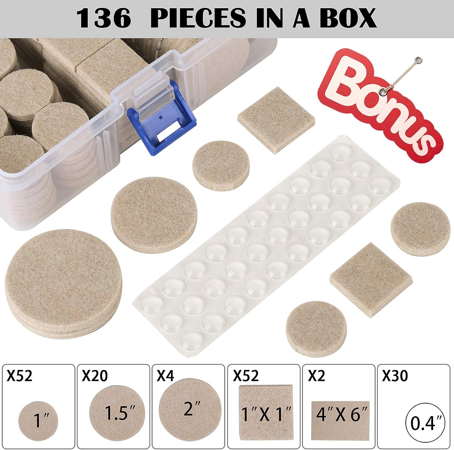 - ❤LARGE VARIETY PACK❤ Our 136PCS Pack with Storage Case contains furniture pads of the 6 most useful sizes, round & square and in beige: (52) 1", (20) 1.5", (4) 2", (28) 1"x1" and (2) 4"x6". Plus you get (30) 0.4"clear rubber bumper pads. These should be more than enough coaster pads to protect all your floors from being damaged by ugly scratches.