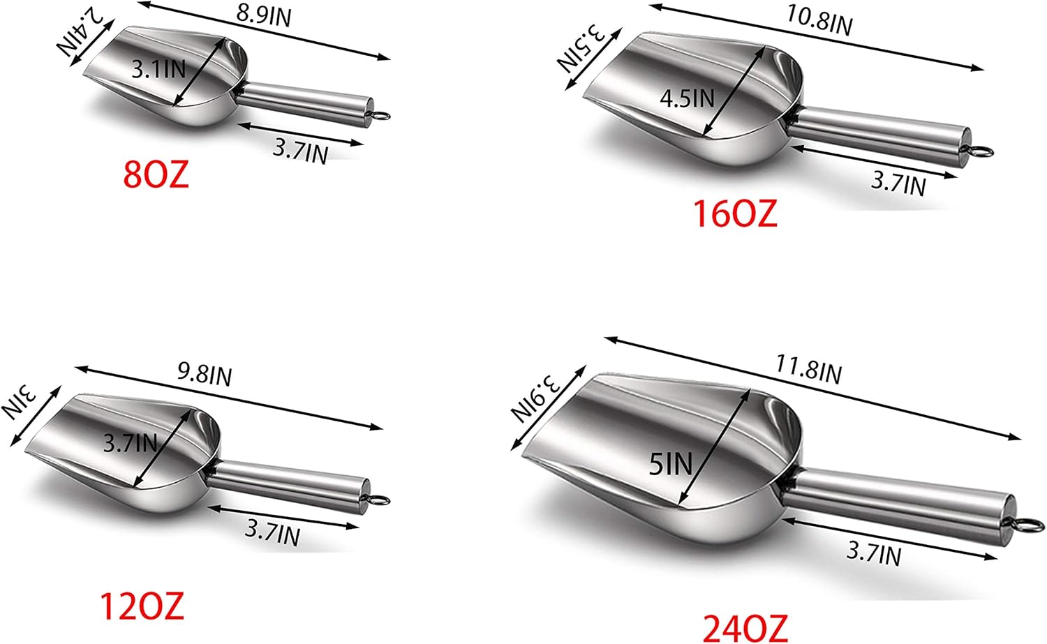 Cedilis 4 Pack Food Ice Scoops, 8oz, 12oz, 16oz, 24oz Stainless Steel Scoop, Heavy Duty Metal Utility Scoops for Candy, Popcorn, Flour, Kitchen Bar Party, Dishwasher Safe