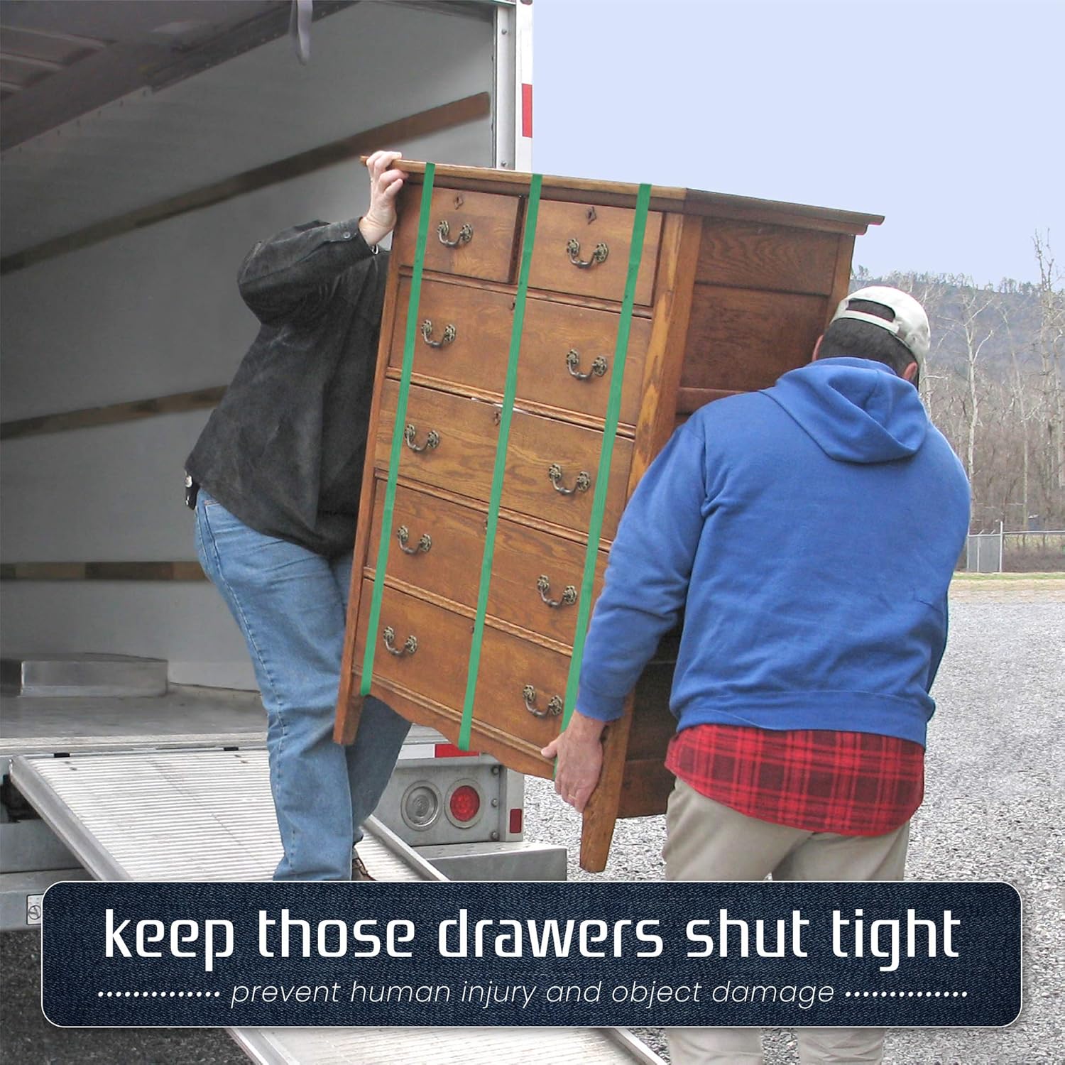 • Keeps Drawers Closed – Prevents dressers and cabinets from opening during transport.