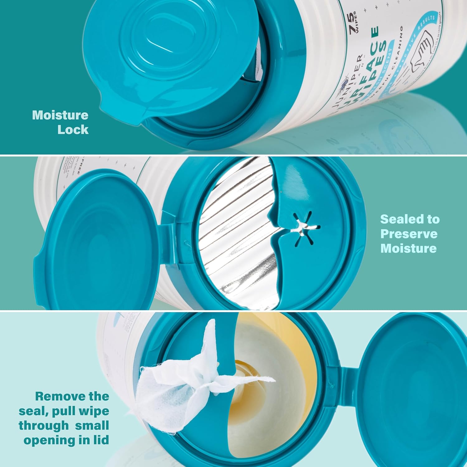 • 【 INCLUDES - CONTAINS 1 PACK CANISTER OF 75 DISPOSABLE 】 Surface cleaning wipes bleach free are a total 75 disposable. Wipe dimensions are 7.5" x 7".