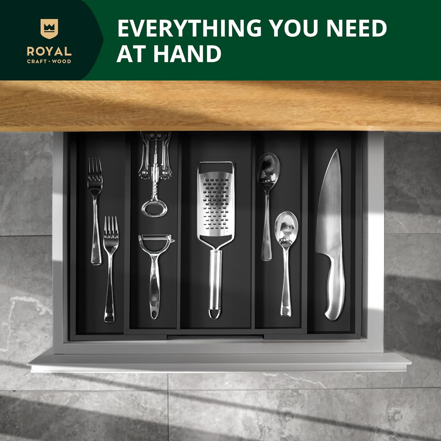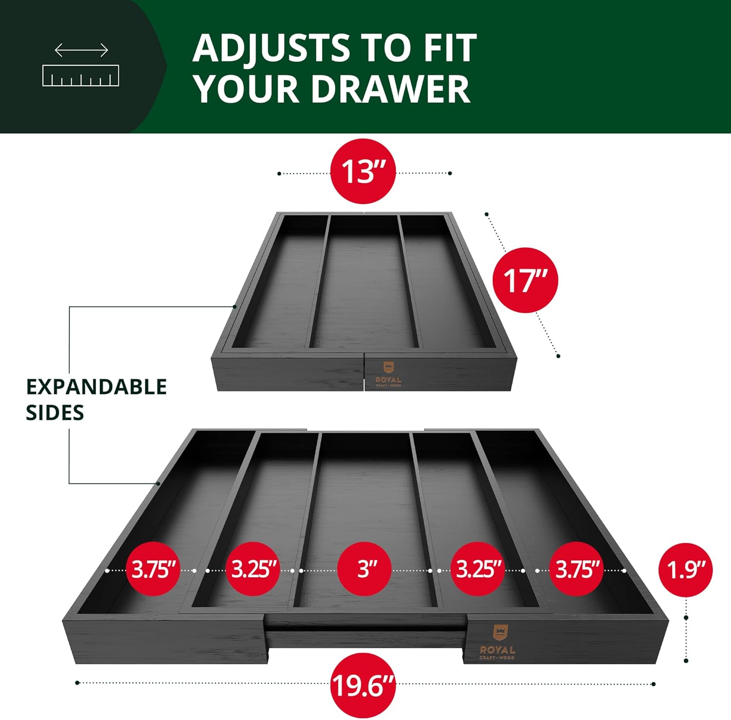 - 📐𝑴𝑬𝑨𝑺𝑼𝑹𝑬 𝒀𝑶𝑼𝑹 𝑫𝑹𝑨𝑾𝑬𝑹 𝑩𝑬𝑭𝑶𝑹𝑬 𝑷𝑼𝑹𝑪𝑯𝑨𝑺𝑬: Please be aware that the Royal Craft Wood Silverware Organizer is a bit deeper and larger than some kitchen drawers. We kindly ask that you MEASURE your home drawer prior to purchase to ensure that this product is a good fit. Please ensure that your drawer space intended to be used with the drawer organizer is LARGER than 20x18” wide for a guaranteed, comfortable fit when fully expanded