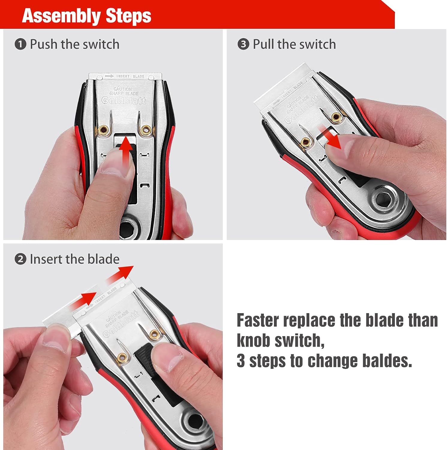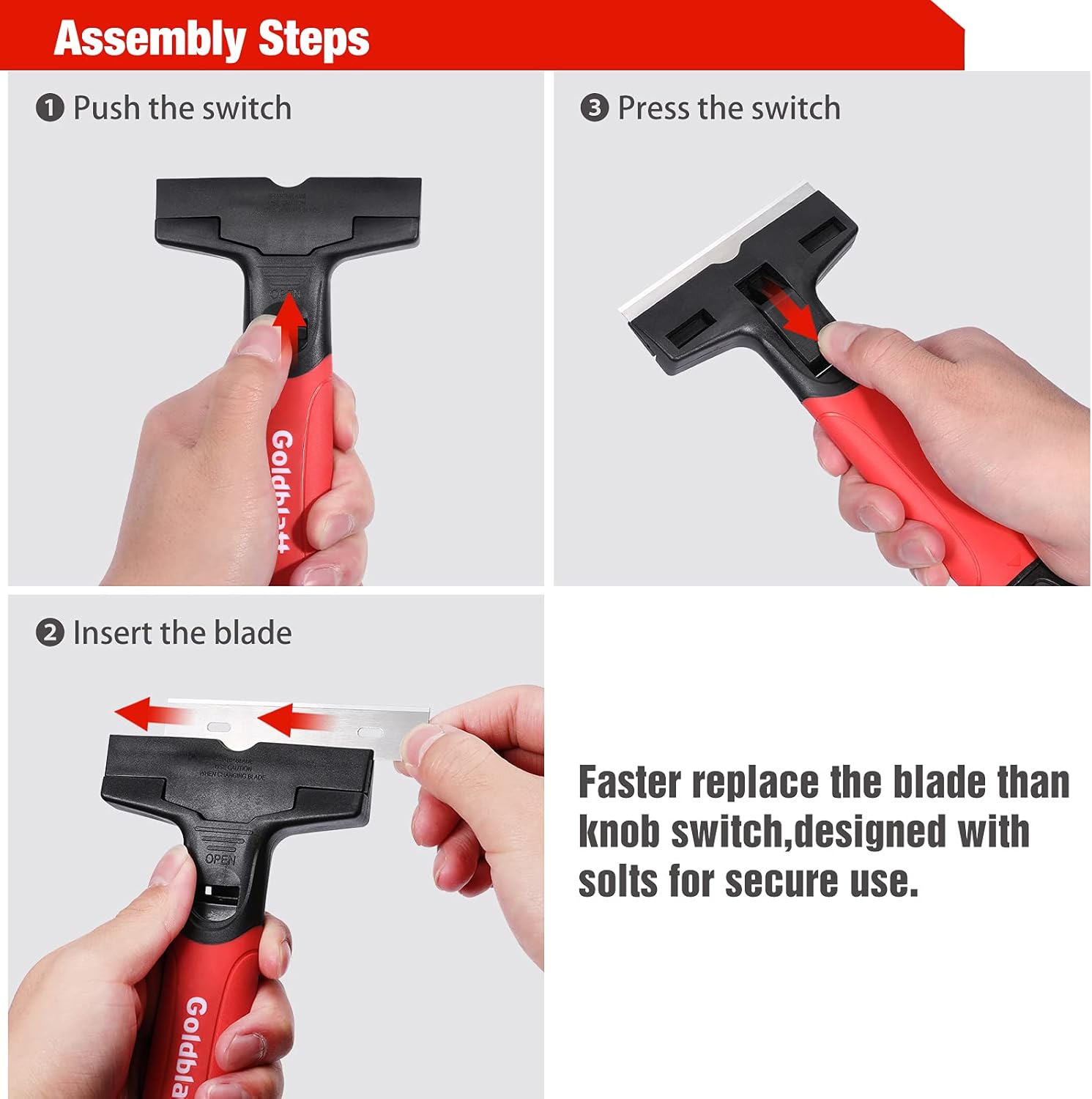 • Easy Assembly: Unlike other scrapers that use knob to assemble blades, Goldblatt scraper set just need to pull and push the switch to replace the blades, No worry about losing knob or bolt. Slot design will securely fix the blades in place for safety use