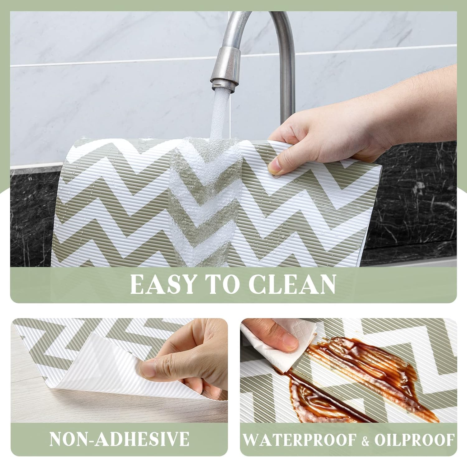 - Waterproof and Easy to Clean- These storage shelf liners are waterproof and dust-proof which keeps belongings in your kitchen cabinet, fridge and drawer organized and protected from grease and spills. The non-adhesive shelf liners are easily removable and can be cleaned with mild soap and water.