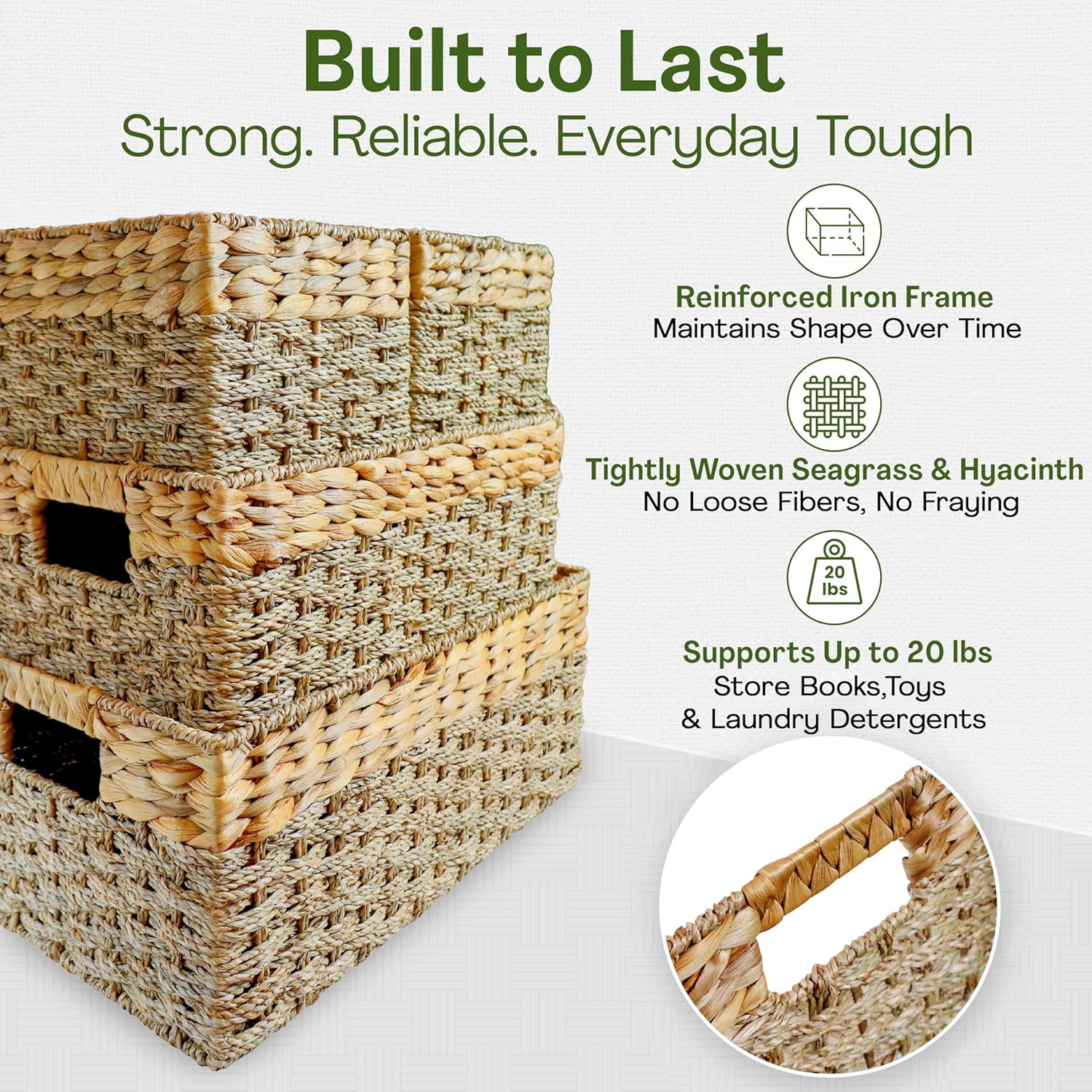 - NATURALLY SAFE AND BEAUTIFUL - Bring warmth and charm with decorative storage baskets, natural seagrass and hyacinth, chemical-free and eco-friendly. The rectangle basket boasts a smooth, woven finish, ensuring lasting beauty without fraying or sharp edges.